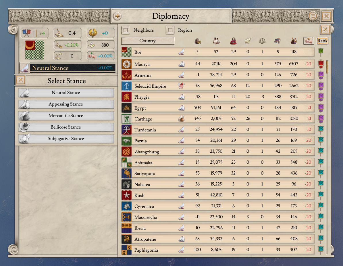 Next, we show attrition losses. These are approximate, since things can become complicated when multiple wars overlap. And, of course, in a game about characters, we also count any characters lost during the war.