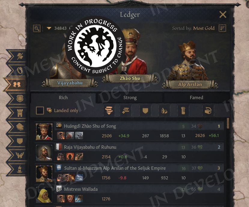 We have split the Characters page into three tabs, and the first tab shows all the economic leaders. Here, we can sort by either total gold or income. It is worth noting that the income sorting is based on total income before expenses, so there is a tooltip that provides more detail on the actual balance.