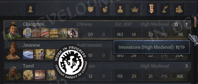In addition, we display the total number of characters and rulers belonging to each culture, along with the total development across all their counties, which is relevant for innovation progress. A progress bar also shows how many innovations each culture has discovered.
