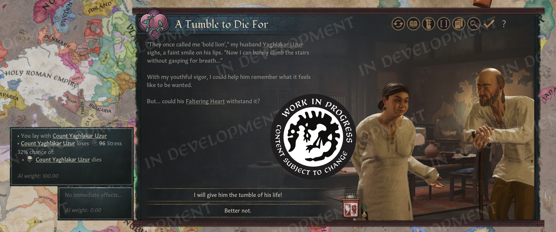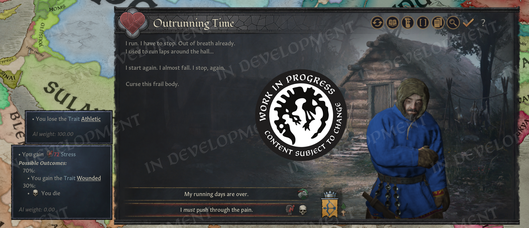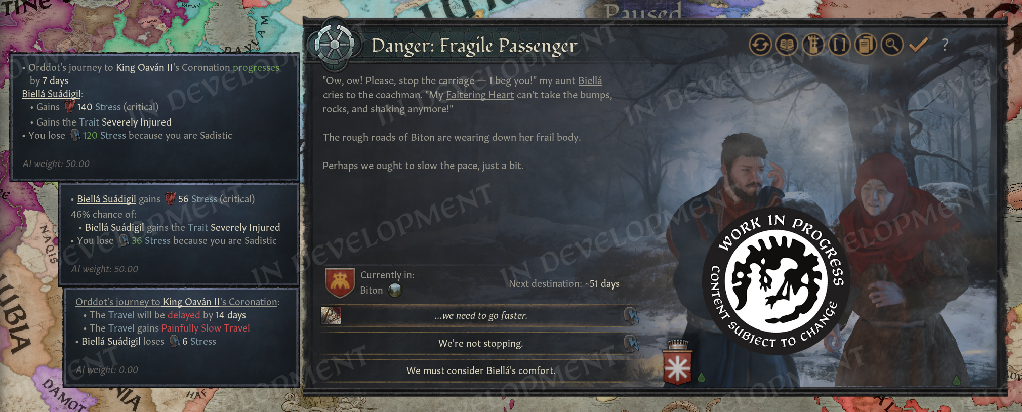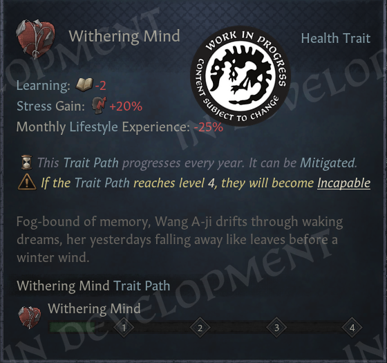 We’ve made some content to make the traits feel present, such as events while traveling, etc. This includes not only events which highlight the Elder Traits you’ve gained, but also events exhibiting the impact of your close family or loved ones having these nasty traits.