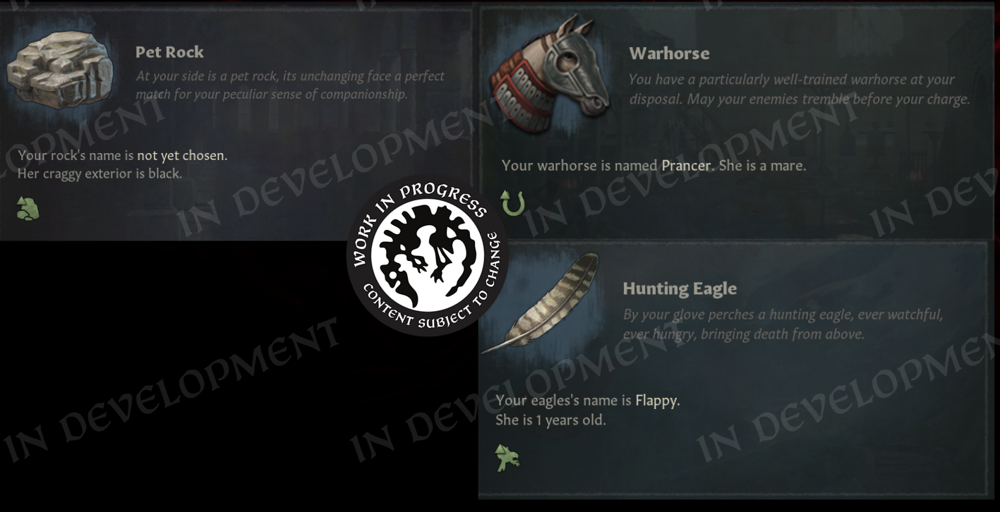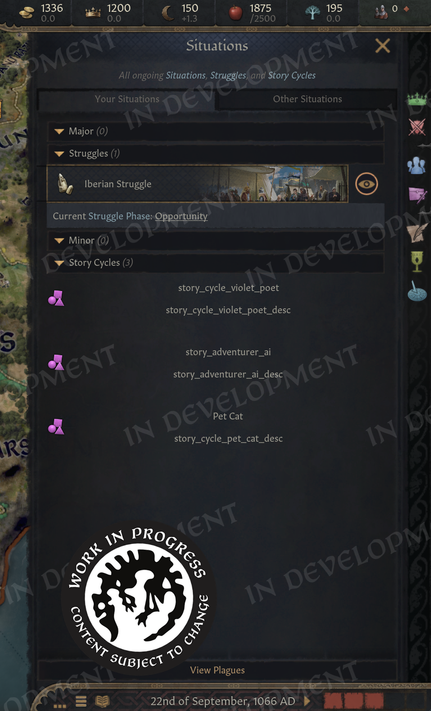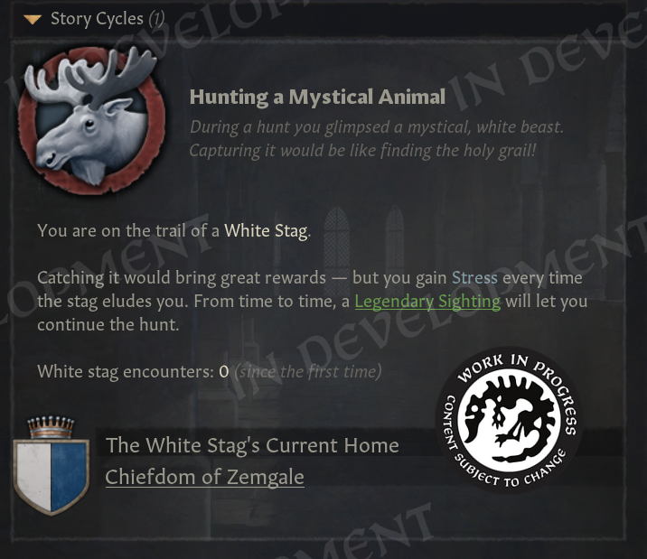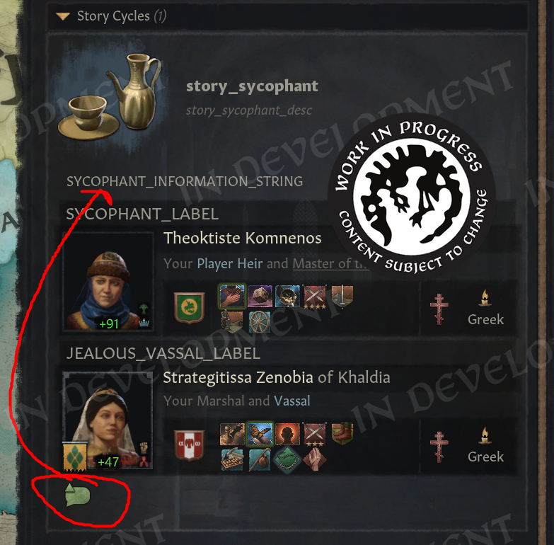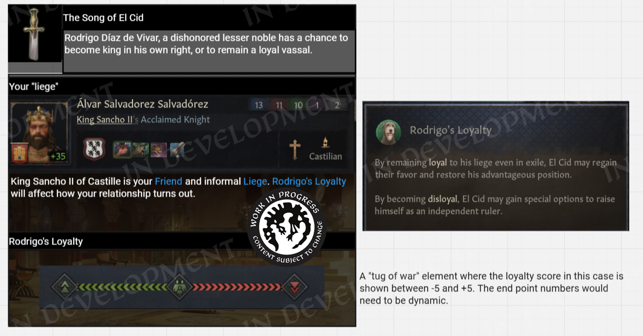 Hi everyone! Welcome to the second part of the Realm Maintenance Dev-Diary. Last week, we unveiled a whole host of features that we’ve been working on together @Agamidaex. We are super excited to see your positive reaction to all of the things we’ve unveiled so far, and can’t wait for you to get your hands on it soon. We deeply believe that our community is our lifeblood, that is why we are constantly trying to find ways of giving back to the community and lift up talented creators through our different programs such as the Creator Packs or this update. Working with Agami has been super fun, and we are hopeful about continuing doing things like this in the future. After all, we still have a ton of other stuff he wanted to work on that were at least equally as exciting as the things we showed off last week, so I think we almost have to at this point! :DOn top of the more than 1,500 individual bug-fixes, tweaks, and changes we’ve done to the game with this update, we want to also highlight a couple of more projects we’ve been working on to improve existing features in different ways. Also, before we start, we won’t be talking more about the Accolade rework, since we believe we went into enough detail in a previous dev diary. If you’re interested to read more about it, please check it out here! We have however been incorporating some of your feedback that we’ve received since revealing the rework, so thank you for that!Alright, to kick it off, I want to introduce @pdx-windy, one of our producers on CK3, who will be showcasing one of his babies that he has been working hard on, and I believe you will all greatly appreciate it.Story TrackerHello everyone, I am Windy and I’ve been producing Crusader Kings 3 for five years now. Thanks to Black Forge Jam I have an opportunity to actually contribute to the game beyond my capacity as a producer, and whatever random script things I do every now and then (to anyone who enjoys the fishing decision for adventurers in Roads to Power, that was me!).This year, for the game jam, I wanted to show how cool story cycle content actually is. We have quite a lot of story cycles in the game actually, some of them just drive AI behavior but a lot of it is fun gameplay. The studio agreed, it is something I think everyone has wanted at one point, it’s a shame they are so hidden away. To achieve this I got a star-studded team to help me develop the “Story Tracker”. I was joined by our Game Director @rageair, 2 (TWO!) whole coders, a game designer, a lot of help from the UI artists, and even our studio manager helped out!PlanningFirst thing is first, how do you go from nothing to something? Well, here my experience as a producer came in handy hehe… First up, what do we even want to show? What questions do we need to answer? What questions do WE have as CK3 players?? After an initial brainstorming session I set out to make some mockups and prototypes on paper and by kitbashing our UIs together to show something. \[Version 0.1 of the story tracker]\[Version 0.2 of the story tracker]It ended up being very bad and very ugly, but it was a first step towards something. Now we could actually start quantifying what is useful, what is not, how we should display different things… All story cycles are very different, they have different things to keep track of, different characters, etc. etc. What even is there to keep track of? Well, to know that we need to list all our story cycles, and what suits us better than a nice spreadsheet…\[Spreadsheet going through every story cycle in the game, what they do, how we should visualize it, whether it's something we want to visualize, and if we’ve implemented it.]Now that we had an idea of what we needed to show, we ended up with a modular system (thanks @rageair!) and UI elements to be able to build on all these different game mechanics found in the story cycles.ImplementationThe very talented code team set to work to expose these things in the UI, and from Game Design’s side it was time to implement a maximum version of a story cycle for debugging. One that would make full use of all the planned elements so that we could layout it properly and see what we needed to do in order to display all the information we wanted to show in a neat and structured way.\[The very first version of the story tracker in game!! v0.3]\[Final paper mockup v0.4, now the interface design is in place!]For each story cycle I designed mockups with elements that are needed for implementation\[Did you know having a dog or cat or horse or rock is a story cycle? Of course it's the one we modelled first] \[Here’s the full board with all the designs (and the pain of implementing it all)]For each element, code wrote GUI script that I could play around with, moving elements around, making sure everything is aligned, using the same amount of vertical and horizontal space… \[Adding elements to the pet dog story…]\[Having stories be considered “personal situations” helped a lot with visibili