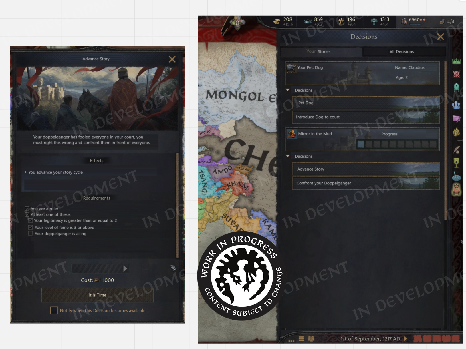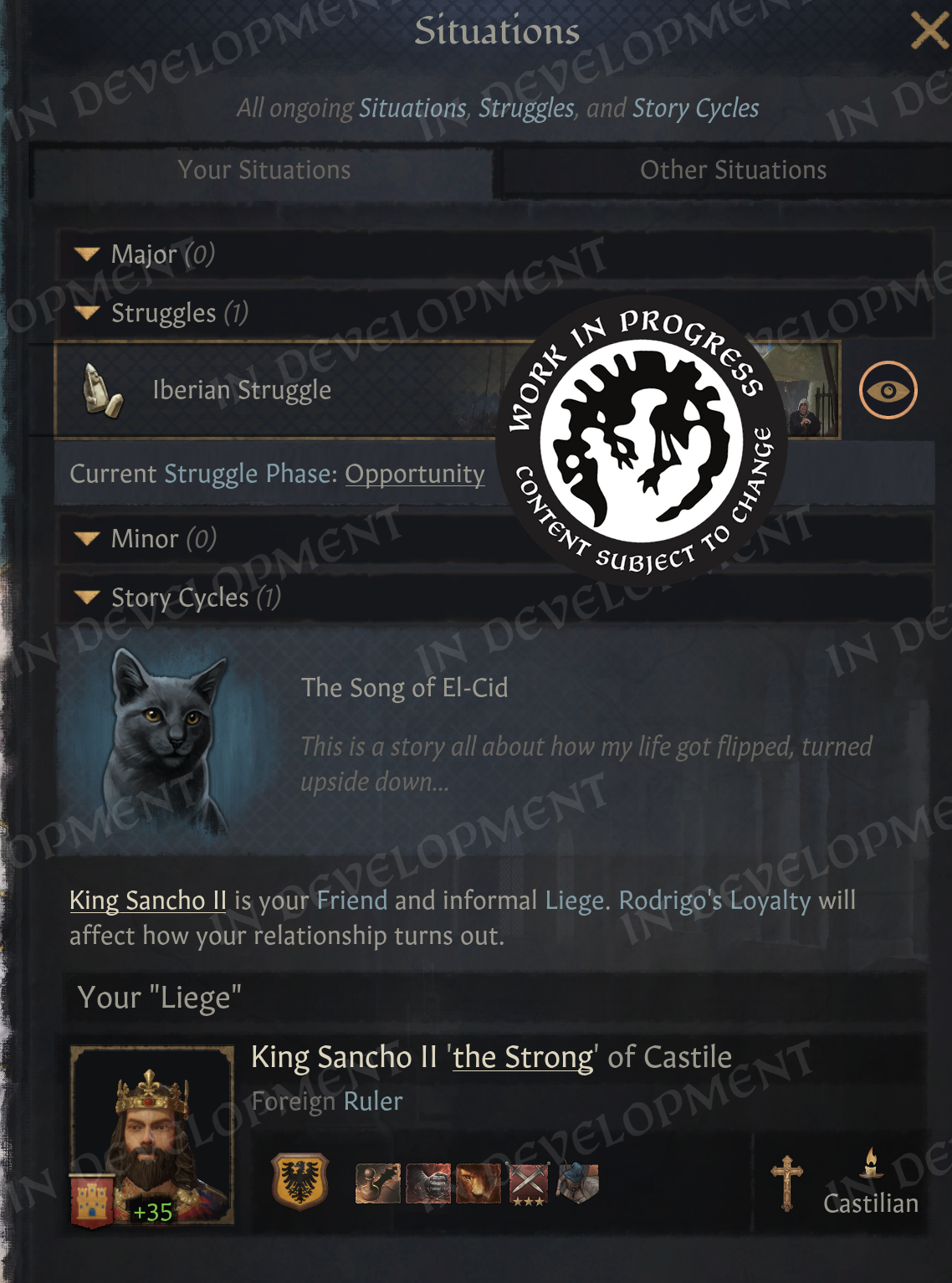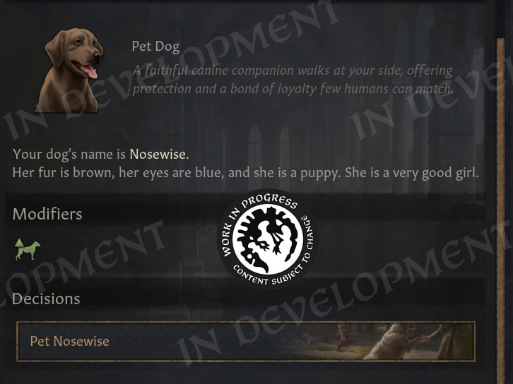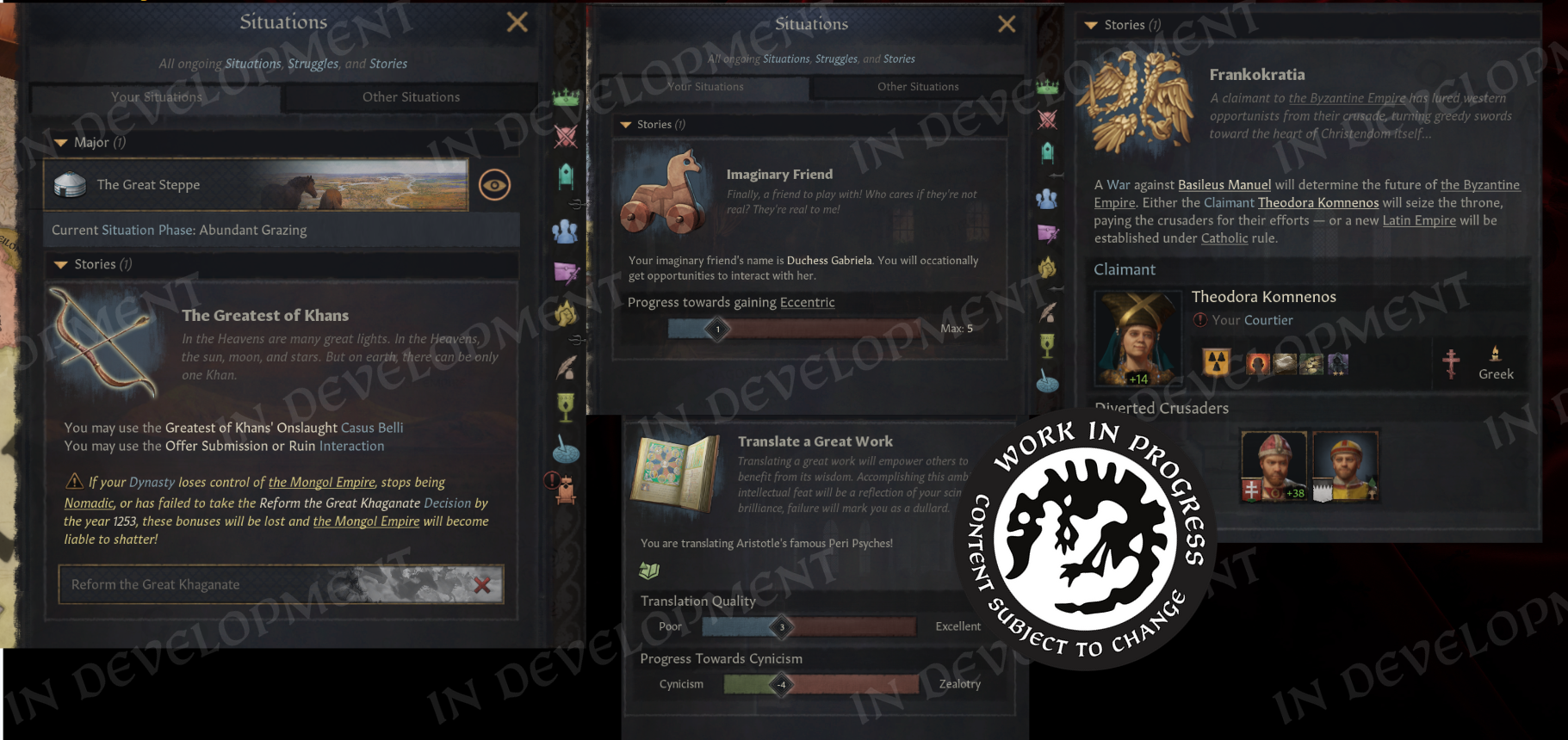 Hi everyone! Welcome to the second part of the Realm Maintenance Dev-Diary. Last week, we unveiled a whole host of features that we’ve been working on together @Agamidaex. We are super excited to see your positive reaction to all of the things we’ve unveiled so far, and can’t wait for you to get your hands on it soon. We deeply believe that our community is our lifeblood, that is why we are constantly trying to find ways of giving back to the community and lift up talented creators through our different programs such as the Creator Packs or this update. Working with Agami has been super fun, and we are hopeful about continuing doing things like this in the future. After all, we still have a ton of other stuff he wanted to work on that were at least equally as exciting as the things we showed off last week, so I think we almost have to at this point! :DOn top of the more than 1,500 individual bug-fixes, tweaks, and changes we’ve done to the game with this update, we want to also highlight a couple of more projects we’ve been working on to improve existing features in different ways. Also, before we start, we won’t be talking more about the Accolade rework, since we believe we went into enough detail in a previous dev diary. If you’re interested to read more about it, please check it out here! We have however been incorporating some of your feedback that we’ve received since revealing the rework, so thank you for that!Alright, to kick it off, I want to introduce @pdx-windy, one of our producers on CK3, who will be showcasing one of his babies that he has been working hard on, and I believe you will all greatly appreciate it.Story TrackerHello everyone, I am Windy and I’ve been producing Crusader Kings 3 for five years now. Thanks to Black Forge Jam I have an opportunity to actually contribute to the game beyond my capacity as a producer, and whatever random script things I do every now and then (to anyone who enjoys the fishing decision for adventurers in Roads to Power, that was me!).This year, for the game jam, I wanted to show how cool story cycle content actually is. We have quite a lot of story cycles in the game actually, some of them just drive AI behavior but a lot of it is fun gameplay. The studio agreed, it is something I think everyone has wanted at one point, it’s a shame they are so hidden away. To achieve this I got a star-studded team to help me develop the “Story Tracker”. I was joined by our Game Director @rageair, 2 (TWO!) whole coders, a game designer, a lot of help from the UI artists, and even our studio manager helped out!PlanningFirst thing is first, how do you go from nothing to something? Well, here my experience as a producer came in handy hehe… First up, what do we even want to show? What questions do we need to answer? What questions do WE have as CK3 players?? After an initial brainstorming session I set out to make some mockups and prototypes on paper and by kitbashing our UIs together to show something. \[Version 0.1 of the story tracker]\[Version 0.2 of the story tracker]It ended up being very bad and very ugly, but it was a first step towards something. Now we could actually start quantifying what is useful, what is not, how we should display different things… All story cycles are very different, they have different things to keep track of, different characters, etc. etc. What even is there to keep track of? Well, to know that we need to list all our story cycles, and what suits us better than a nice spreadsheet…\[Spreadsheet going through every story cycle in the game, what they do, how we should visualize it, whether it's something we want to visualize, and if we’ve implemented it.]Now that we had an idea of what we needed to show, we ended up with a modular system (thanks @rageair!) and UI elements to be able to build on all these different game mechanics found in the story cycles.ImplementationThe very talented code team set to work to expose these things in the UI, and from Game Design’s side it was time to implement a maximum version of a story cycle for debugging. One that would make full use of all the planned elements so that we could layout it properly and see what we needed to do in order to display all the information we wanted to show in a neat and structured way.\[The very first version of the story tracker in game!! v0.3]\[Final paper mockup v0.4, now the interface design is in place!]For each story cycle I designed mockups with elements that are needed for implementation\[Did you know having a dog or cat or horse or rock is a story cycle? Of course it's the one we modelled first] \[Here’s the full board with all the designs (and the pain of implementing it all)]For each element, code wrote GUI script that I could play around with, moving elements around, making sure everything is aligned, using the same amount of vertical and horizontal space… \[Adding elements to the pet dog story…]\[Having stories be considered “personal situations” helped a lot with visibili