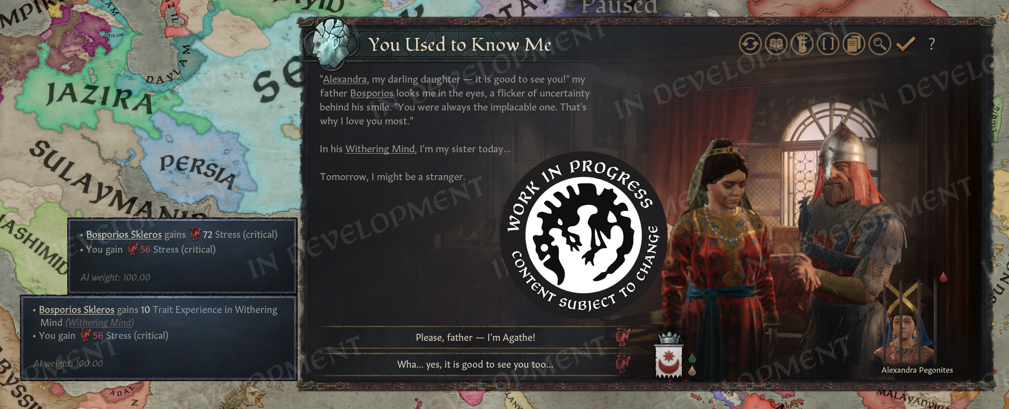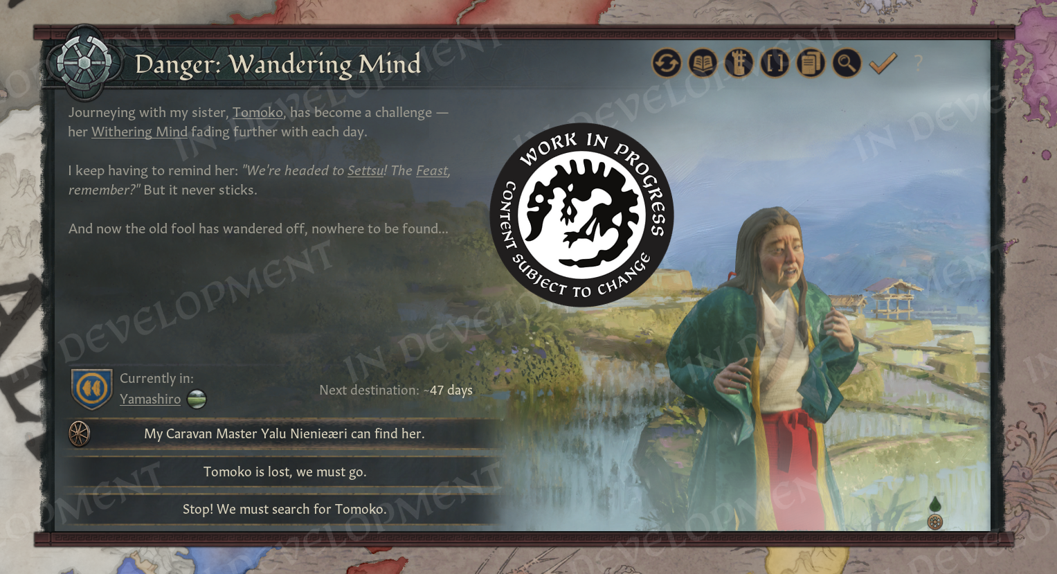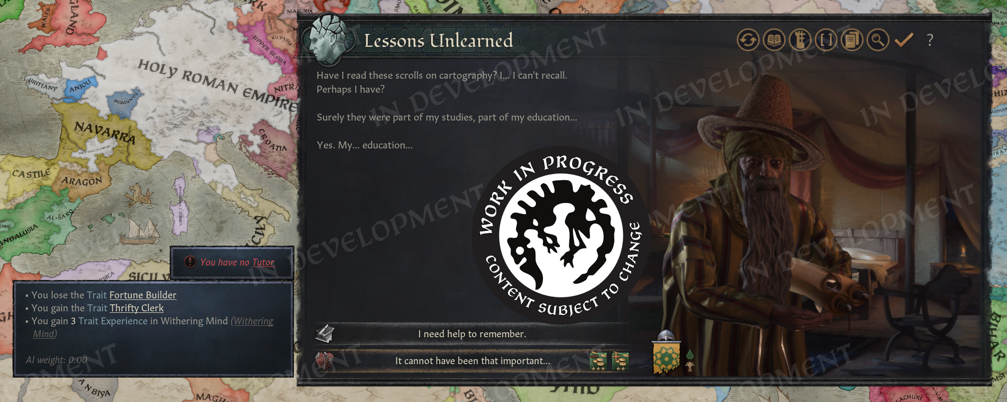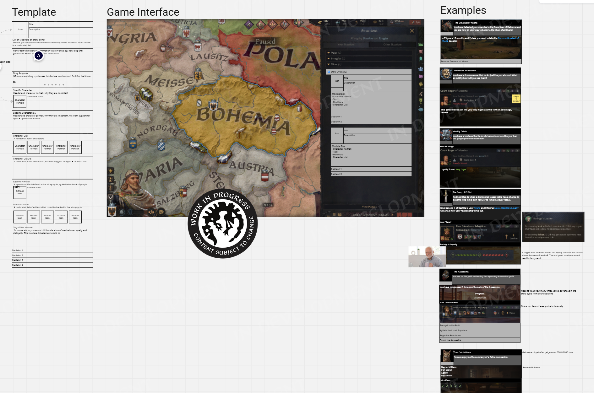 Hi everyone! Welcome to the second part of the Realm Maintenance Dev-Diary. Last week, we unveiled a whole host of features that we’ve been working on together @Agamidaex. We are super excited to see your positive reaction to all of the things we’ve unveiled so far, and can’t wait for you to get your hands on it soon. We deeply believe that our community is our lifeblood, that is why we are constantly trying to find ways of giving back to the community and lift up talented creators through our different programs such as the Creator Packs or this update. Working with Agami has been super fun, and we are hopeful about continuing doing things like this in the future. After all, we still have a ton of other stuff he wanted to work on that were at least equally as exciting as the things we showed off last week, so I think we almost have to at this point! :DOn top of the more than 1,500 individual bug-fixes, tweaks, and changes we’ve done to the game with this update, we want to also highlight a couple of more projects we’ve been working on to improve existing features in different ways. Also, before we start, we won’t be talking more about the Accolade rework, since we believe we went into enough detail in a previous dev diary. If you’re interested to read more about it, please check it out here! We have however been incorporating some of your feedback that we’ve received since revealing the rework, so thank you for that!Alright, to kick it off, I want to introduce @pdx-windy, one of our producers on CK3, who will be showcasing one of his babies that he has been working hard on, and I believe you will all greatly appreciate it.Story TrackerHello everyone, I am Windy and I’ve been producing Crusader Kings 3 for five years now. Thanks to Black Forge Jam I have an opportunity to actually contribute to the game beyond my capacity as a producer, and whatever random script things I do every now and then (to anyone who enjoys the fishing decision for adventurers in Roads to Power, that was me!).This year, for the game jam, I wanted to show how cool story cycle content actually is. We have quite a lot of story cycles in the game actually, some of them just drive AI behavior but a lot of it is fun gameplay. The studio agreed, it is something I think everyone has wanted at one point, it’s a shame they are so hidden away. To achieve this I got a star-studded team to help me develop the “Story Tracker”. I was joined by our Game Director @rageair, 2 (TWO!) whole coders, a game designer, a lot of help from the UI artists, and even our studio manager helped out!PlanningFirst thing is first, how do you go from nothing to something? Well, here my experience as a producer came in handy hehe… First up, what do we even want to show? What questions do we need to answer? What questions do WE have as CK3 players?? After an initial brainstorming session I set out to make some mockups and prototypes on paper and by kitbashing our UIs together to show something. \[Version 0.1 of the story tracker]\[Version 0.2 of the story tracker]It ended up being very bad and very ugly, but it was a first step towards something. Now we could actually start quantifying what is useful, what is not, how we should display different things… All story cycles are very different, they have different things to keep track of, different characters, etc. etc. What even is there to keep track of? Well, to know that we need to list all our story cycles, and what suits us better than a nice spreadsheet…\[Spreadsheet going through every story cycle in the game, what they do, how we should visualize it, whether it's something we want to visualize, and if we’ve implemented it.]Now that we had an idea of what we needed to show, we ended up with a modular system (thanks @rageair!) and UI elements to be able to build on all these different game mechanics found in the story cycles.ImplementationThe very talented code team set to work to expose these things in the UI, and from Game Design’s side it was time to implement a maximum version of a story cycle for debugging. One that would make full use of all the planned elements so that we could layout it properly and see what we needed to do in order to display all the information we wanted to show in a neat and structured way.\[The very first version of the story tracker in game!! v0.3]\[Final paper mockup v0.4, now the interface design is in place!]For each story cycle I designed mockups with elements that are needed for implementation\[Did you know having a dog or cat or horse or rock is a story cycle? Of course it's the one we modelled first] \[Here’s the full board with all the designs (and the pain of implementing it all)]For each element, code wrote GUI script that I could play around with, moving elements around, making sure everything is aligned, using the same amount of vertical and horizontal space… \[Adding elements to the pet dog story…]\[Having stories be considered “personal situations” helped a lot with visibili