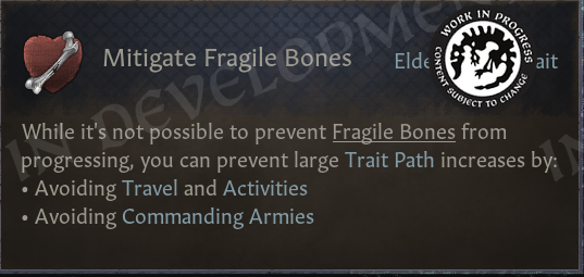 Some of the mitigations for Withering Mind are things that actually worsen the state of other Elder Traits. For instance, traveling is bad for those with Fragile Bones, but good for those with Withering Mind.