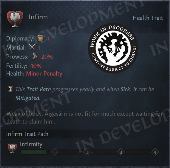 The Infirm trait is now tiered, just like the other traits, and no longer reduces intrigue or learning - it now represents a general physical degradation of the body. As this trait is still one of the most impactful traits in the Elder Trait category, it’s now much more rare. It’s extremely unlikely that you’ll get infirm without already having gained one or more of the other Elder Traits first.