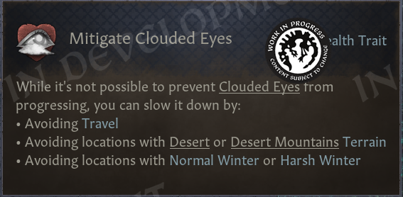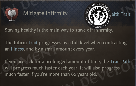 Since some time, we’ve had the tool to make this situation into something better - tiered traits. There’s now a selection of elderly traits, all medievally-flavored versions of real-life afflictions, that start out very mild but grow in severity over time. This includes the previously mentioned Infirm trait, which is now also tiered. Worth noting is that I didn’t want a repeat of the ‘Harm Events’ feature (which threw random events at the player which they couldn’t do anything about), so a crucial element of Elder Traits is offering methods for players to mitigate both: 1. Getting the traits in the first place, and 2. How fast they progress.