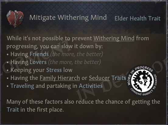 Your lifestyle has a large impact on whether you get Elder Traits - but there’s also a genetic component, and a certain degree of luck involved. Generally doing what you most often already do, like keeping your character healthy and free of stress, will reduce the chances of getting the traits. Note that the game concept will not list all factors, only the most major ones. Some of the more ‘niche’ playstyles and lifestyles are more socially-oriented, and thus counter mind-related afflictions: so now you have new reasons to pursue the diplomat/seducer trees!