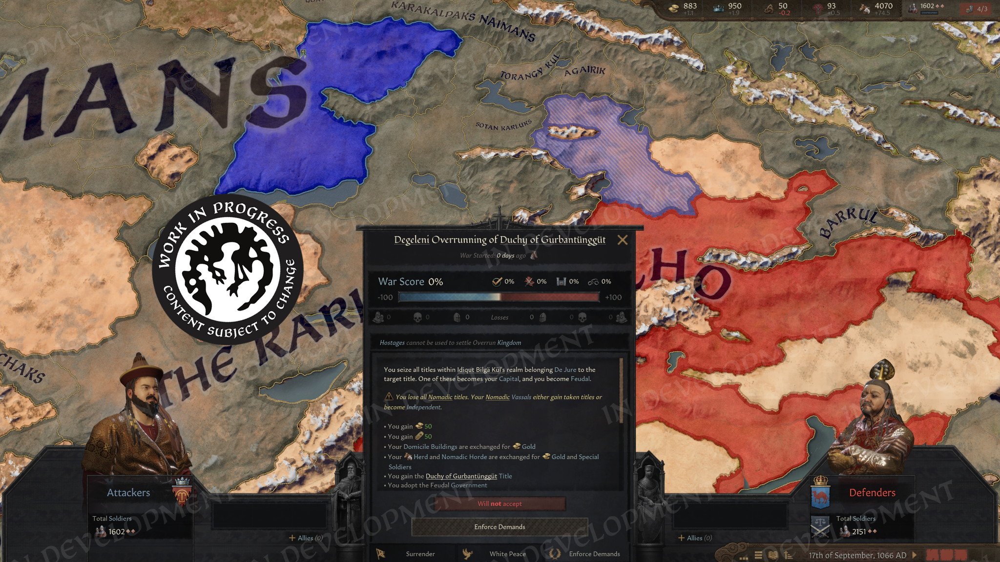 The Humiliation Casus Belli will now not only demote nomads in Dominance level, but will break off their non-capital border counties as independent herders.