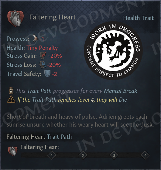 The most stress-linked Elder Trait is Faltering Heart, which progresses in severity the more stress breaks your character suffers. The trait itself increases stress gain and reduces stress loss, but for a careful player this is the easiest trait to avoid worsening. If you reach its rank 4, you will die.