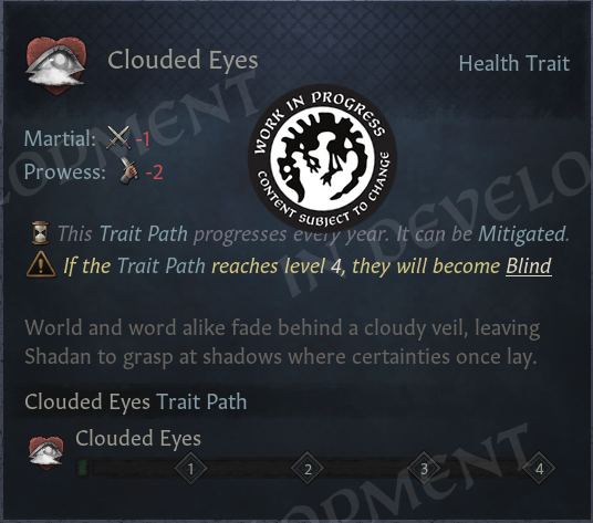 As an added detail, characters with this trait will actually have clouded eyes visible on their portrait.