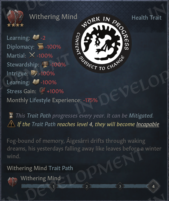 This trait is the reason we’ve added multiplicative skill modifiers in this Update - for each advancement on the track, you’ll lose 25% of your skills. No matter how high those skills are. You can have a learning skill of 5 or 50 - you’ll slowly slide down the slope of oblivion regardless…