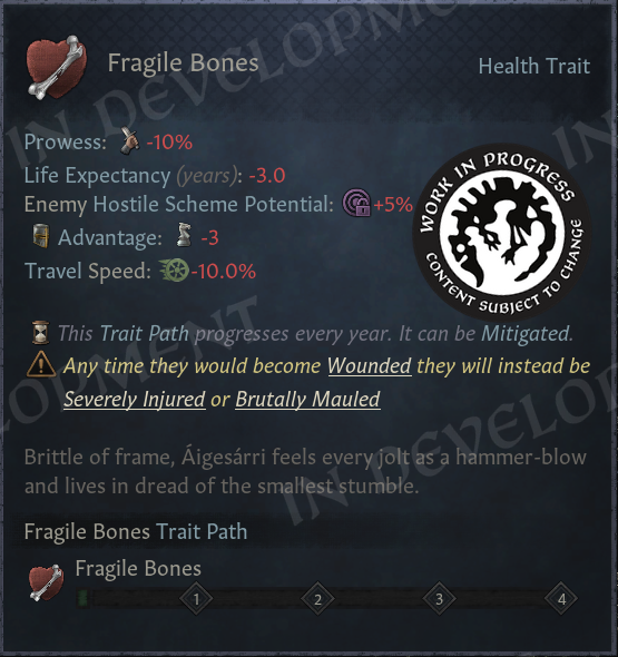 Fragile Bones is unique in that it doesn’t convey any direct health penalties - it just makes everything surrounding health worse for your character. The trait lowers your life expectancy (which means aging will cause you to lose health slightly faster than usual), makes your frail mortal form easier to murder, and makes any wounds you suffer worse. Yes, that’s right! Whenever you would become Wounded, your Fragile Bones trait will instead cause you to become Severely Injured, or Brutally Mauled if the trait rank is high.