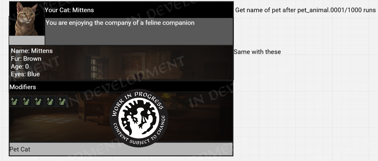The very talented code team set to work to expose these things in the UI, and from Game Design’s side it was time to implement a maximum version of a story cycle for debugging. One that would make full use of all the planned elements so that we could layout it properly and see what we needed to do in order to display all the information we wanted to show in a neat and structured way.