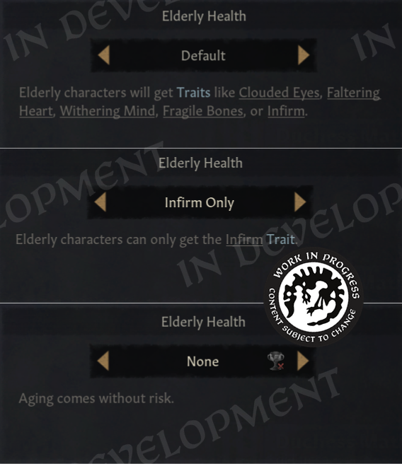 If you prefer the ‘old’ way of representing Elder Traits with only the Infirm trait, we have added a game rule where you can customize that to your preference. The only option that disables Achievements is the one disabling aging consequences altogether.