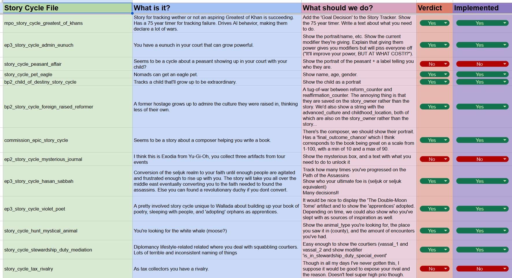 \[Spreadsheet going through every story cycle in the game, what they do, how we should visualize it, whether it's something we want to visualize, and if we’ve implemented it.]