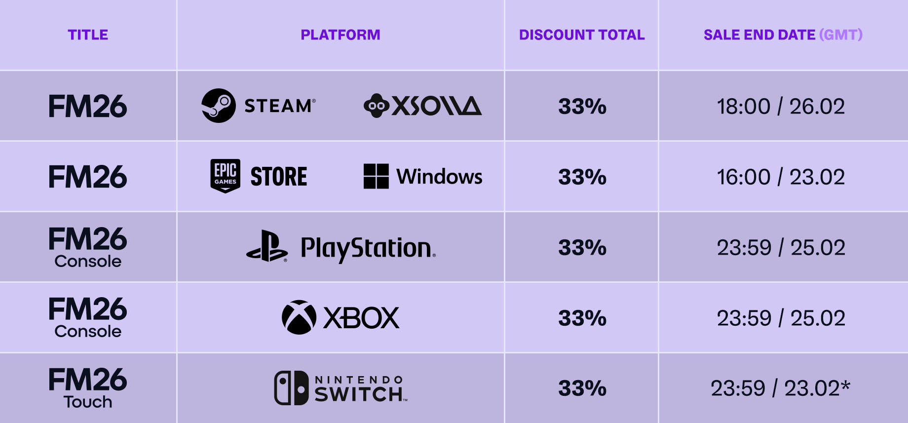 FM26 (PC/Mac), FM26 Console (Xbox/PS5) and FM26 Touch (Nintendo Switch) are available with a 33% discount until 6pm GMT on 26 February. Sale end dates and times vary by platform – more info is provided in the table below.