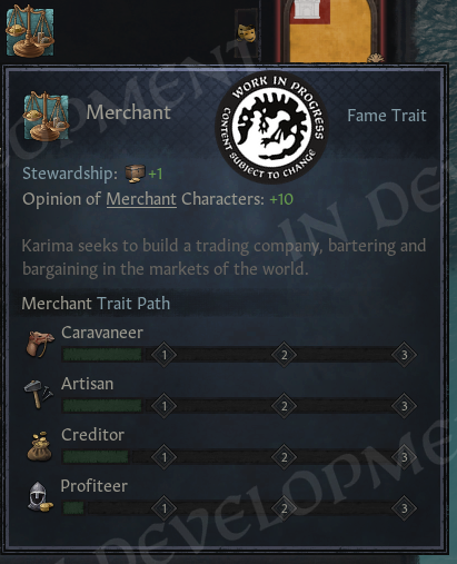 Merchants have a gameplay loop focused on making gold, which can be turned into prestige. Prestige, in turn, will open up opportunities for improving how much gold you can make. As merchants, similar to their landless adventure peers, aren’t blue-blooded, they have a bit of a harder time making prestige than regular landed rulers, and they need it to be taken seriously if they are to engage with the nobility for trade deals and the like.