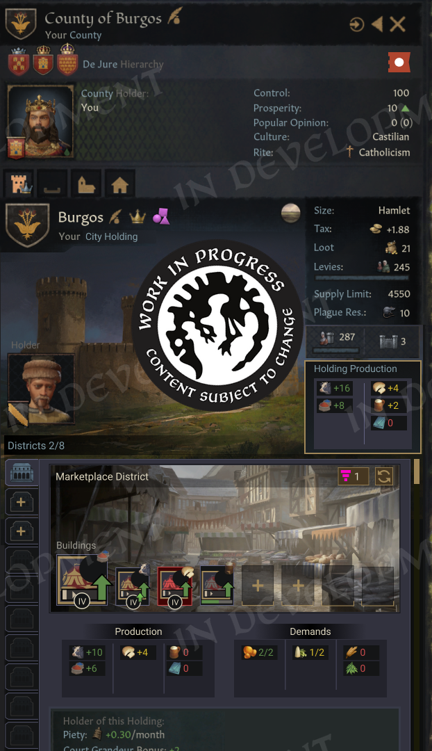 Settlement Size is a measure of how many people live in the city in the barony (a county capital will differ from other holdings, for example). We will use a 1-10 scale to track size in a somewhat abstract way. Size will directly affect how many district slots are available in the province, so you will, for example, see a whole lot more districts in Constantinople than you would in, e.g., the capital of Sweden. But in turn, we have added new rural districts that will benefit from smaller sizes, while counties with larger settlements face challenges to both county control and popular opinion within the county.