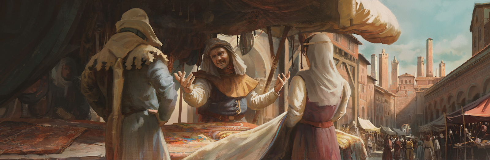 Hello there,Today I have the honor of telling you a little bit about what is coming in this year’s major expansion, Silk & Silver. I talked a little bit about it in the announcement video, but this is the moment to put it all out here in a bit more detail for your enjoyment. Strap in, because we have a whole lot of different things to go through!Unlike this beautiful illustration we got from one of our artists, there will be a number of unfinished things pictured in this thread, as the expansion is still in the middle of its development. Keep that in mind as you read through the dev diary.The Vision of Silk & SilverIn the High Middle Ages, Flanders imported high-quality wool from England and transformed it into fine clothing sought after across Europe. Silk came from the Far East through the Silk Roads. You saw the rise of numerous republics and free cities, signaling the emergence of a new class. The burghers, the merchants, not people who had the right background or dynastic blood, but the ones who knew how to make money and use it well. For Silk & Silver, we wanted to really showcase the period's growth, as it was, in many ways, a very transformative time in history. Small villages and hamlets would become flourishing cities, and already notable cities would grow into historical metropolises. From the 11th to the 14th centuries, Paris grew from 20,000 to 30,000 people to over 200,000, and we want this to be something one could experience in the game in some capacity.So what were our goals going into this expansion?Rework the economy of the entire gameMake trade, merchants, and republics an integral part of the economic simulation of the gameDistinguish between different cities and areas of the map, e.g., Paris is not the same as any other French cityMake the map visualize the growth and change of the world over timeThese are the main pillars of this DLC and the accompanying patch:MerchantsRepublicsTradeEconomy ReworkBefore we look at anything else, we will start by taking a look at trade. As an entirely new feature that connects everything else in the expansion, it’s good to get everyone on the same page with what it is and what it isn’t, before we move on to the other features.Trade is a new feature that allows merchants and republics to move trade goods around the world to meet demand in different markets. At its core, it is about finding areas that produce a trade good and supplying it to areas that need it. It will primarily be done by mercantile governments (merchants & republics), but landed rulers may be able to move goods within their lands to a lesser extent. Every duchy in the world counts as its own separate market, and every province will have a new set of buildings (this will be discussed later) that will produce or require trade goods for its market, meaning we have just over 900 separate markets in the world of CK3 come Silk & Silver. For trade goods produced within a market, they will be available for local consumption before they are available for purchase by foreign traders. As for trade goods, they are special goods created in provinces across the whole world. You will build farms, mines, or workshops that will create, grow, or mine different types of trade goods that can, in turn, be used or repurposed in other buildings. Every county now has a new type of slot focused on crafting/making these trade goods, which we call the “resource district” (more about districts later). I won’t give you a full list of all our new trade goods right now, but you can see a selection below (we have just short of 50 trade goods in total).These trade goods will then, in turn, be consumed by new “building needs”. A need is effectively an optional modifier on a building that will only be active if it is regularly supplied with the trade good (or goods) it needs. For example, a fishing hut may produce more fish if it is regularly supplied with salt, and a port may produce more taxes if it is supplied with wood for its ships. For landed rulers, this means trade goods will be necessary to make the most of their lands, whereas for mercantile rulers, it means an opportunity to profit from bringing goods over. When establishing a trade route, you have a fair number of limitations that decide what you can do with a trade route:Number of trade goods on the routeNumber of markets on the routeLength of the routeHow many goods can be moved on the route in totalHow competitive the route isAs a newly minted merchant setting up your first trade route, you are fairly limited in both scope and potential for what you can do with your trade route. You will find some key goods you can work with in your vicinity, and then trade relatively close by (think up to a couple of markets away at most).At first, it will be a small trickle of gold that comes in regularly as you are still finding your footing, before your trade company and family become better known for your mercantile endeavors. As you continue trading a specific trade