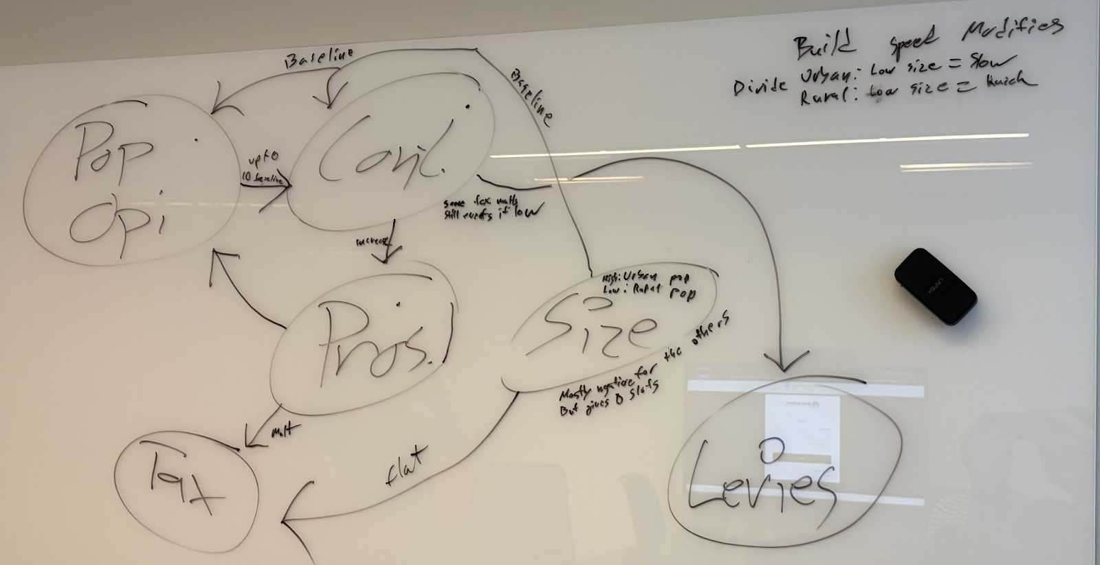 As a fun little side note, here’s a picture from one of our whiteboard sessions, trying to make a good visual map of what affects what. I am sorry for our terrible handwriting. But not sorry enough not to share the picture. Note that these are, of course, not the only things interacting with these different values, but it is rather about how these specific values interact with each other.