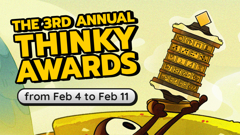 Welcome to the 3rd Annual Thinky Awards!This celebration of the very best thinky games of 2025 highlights games that get you thinking, asking you to carefully reason your way through challenges until you hit one of these sweet "aha!" moments. 2025 was such an excellent year for the scene, it was hard to keep nominations to a reasonable number!The Awards in most categories were voted by a jury of developers, content creators, and thinky fans. Three community choice awards were also voted by our wonderful public — thank you to all voters!We've set up a Sale Page so you can browse the categories and enjoy the show when we announce the winners in a broadcast on February 4. There's been so many great thinky games released in 2025, it's honestly hard to keep track of them sometimes. Hopefully this page comes in handy!Note that our complete nominations include a number of games that are not published on Steam. And our Best Content Creator nominees also cannot be displayed on a sale page — I'll be stating the obvious here, but these are people, not games! Head over to our website to browse the full list of nominees.The Thinky Awards are organized by Thinky Games, a website and community for fans of games that really make you think. There are various ways you could join us:Play the Thinky Dailies: the Thinky Dailies are free puzzle treats you can play in your browser. Season 1 just wrapped up after 61 puzzles that include logic grids such as Nonograms or Irregular Sudokus, and also some visual riddles drawn by our talented artist!Subscribe to our newsletter: every 2 weeks, we send out some of the latest thinky happenings and a free web game recommendation. Follow us on our socials or join our DiscordFollow our curator page on Steam Tune in to our Awards show on February 4 at 10am PT / 1pm ET / 6pm UTC to discover the winners, and check out our event page afterwards: despite all of this happening on short notice, several games among the nominees will be discounted for a week!