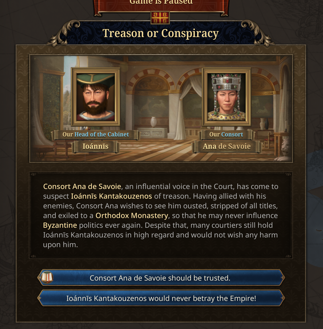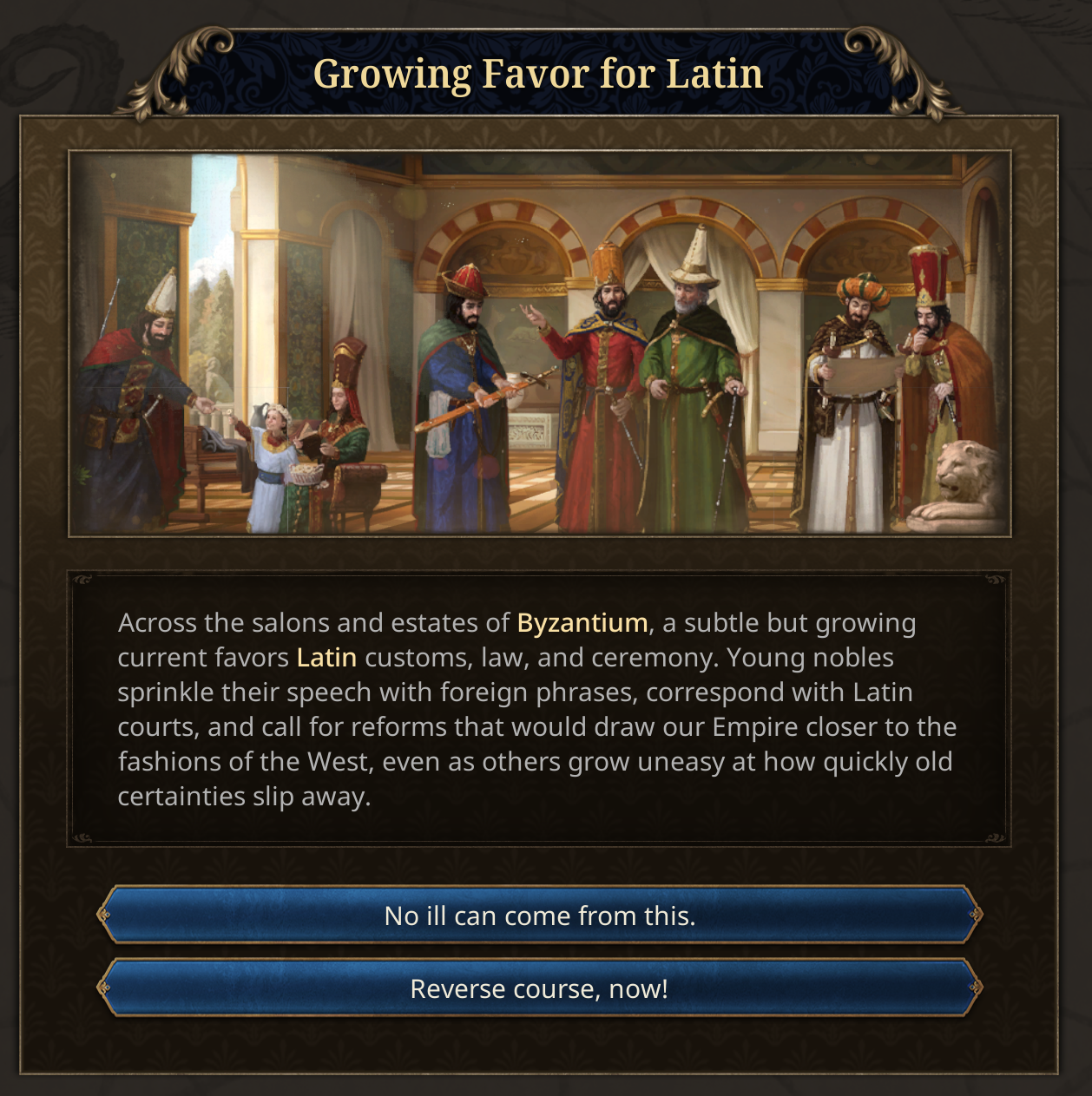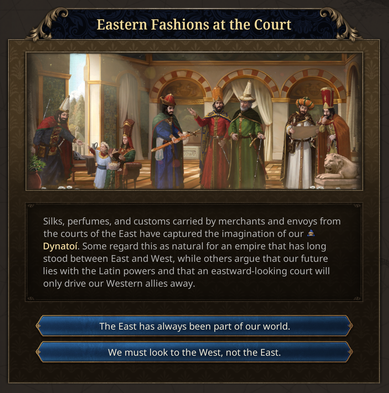 Friends, Romans, countrymen, lend me your ears. For today we will be looking into some of the miscellaneous content in the Fate of the Phoenix immersion pack.Some of the earlier events are focused around John Kantakouzenos, the nobleman who served under the incumbent Andronikos III, and eventually became emperor himself. He starts as the Head of the Cabinet, reflecting his position as Megas Domestikos. In real life, he lived to a venerable age of 91, and so his life expectancy is given a significant boost in the setup.In real life, he rejected Co-Emperorship, at least to begin with. But if you force him down that path, it opens up an event chain of courtly intrigue of Ana de Savoie.His position as Head of the Cabinet will now also put him in a prime position to take over the Regency, as he historically did upon the death of Andronikos III.We are also introducing a new Subject Type called the Prónoiai, based on the real Byzantine Prónoiai system, conditional land grants from the Emperor to military officers and officials, which evolved from temporary tax-collection appointments into hereditary holdings combining fiscal and military duties. It is more extractive than a vassal, giving gold, sailors, and manpower to the overlord, and increases the owner’s monthly legitimacy but also pushes towards decentralization.What have the Romans ever done for us? Well, some cities will start with an aqueduct system.Philipp Melanchton was a close ally of Martin Luther, and he was fascinated by the Eastern church. When the reformation happens, the country housing Philipp Melanchthon will be able to petition Byzantium for assistance. They can respond, either choosing to look upon Lutheranism favourably or aloofly ignoring them.In the past, the Byzantines deployed a napalm-like substance whose recipe was a closely guarded secret. So closely guarded in fact that by 1337 the recipe was lost to time. However the Byzantines had a cultural memory and fascination with Greek Fire, so if you have a scientist in Byzantium, you can sponsor them to rediscover Greek Fire, a costly and dangerous process that has a high chance of ending in failure.If the scientist succeeds, the secret of Greek Fire will give you access to Siphōnes fire galleys, which will aid you in defending the Bosphorus.Societal ValueBased on community feedback, we’ve been revisiting how we frame the Latinitas vs Hellenismos societal value. Our original design did not fully capture the nature of the choices facing the Byzantine Empire in the 14th and 15th centuries.Latinitas is now more clearly associated with engagement with the contemporary Latin West. It represents the political influence of the internal factions who believe that the Empire’s survival depends on closer ties with the Latins through diplomacy, religious compromise, and the selective adoption of Western currents and Renaissance thought. Shaped by contact with Frankish kingdoms and Italian republics, Latinitas looks for foreign support and renewal in a time of mounting pressure. As the Empire expands into historically Romance regions, particularly in Italy, this outlook may strengthen further, encouraging accommodation and integration with Latin elites and populations.The illustration will also change to be less Imperator’s SPQR and instead reflect Renaissance Italy’s depictions of their nostalgia for Pax Romana.Meanwhile, Hellenismos has been reworked into Romanismos. It reflects the political power of those who understand that the Empire endures through its unbroken Roman inheritance: rooted in Constantinople as the seat of empire, upheld by the Orthodox Church, and sustained by long-established imperial institutions. Romanismos does not represent a novel Greekish direction, but the continuation of what already exists: the Roman Empire as it has always been, requiring preservation rather than transformation.You will get several events as you navigate this political dichotomy that represent the real push-and-pull that was happening inside the Byzantine court.And on the topic of events, we have also been working on a much-requested quality of life tool for players to see the list of unique events that a country has access to. Players will be able to use a searchable, filterable, tooltippable database of Dynamic Historical Events, so they can plan out which path they want to go down and see why some events fire and some events don’t. Bear in mind this is very WIP.This Tinto Talks has just a hint of the kind of content you can find in Fate of the Phoenix, but there is a lot more to discover as you play.In the patch 1.2 Echinades we have also added a lot of free content to countries in the Byzantine sphere. There 5 new works of art in the Balkans, over 300 new advances spread around Greek Minors, Frankokratia, and the Balkans, more than a hundred new events, new government reforms, privileges, etc. The whole region will now be a much more exciting place to rule in.Next week we will take a look at what the c