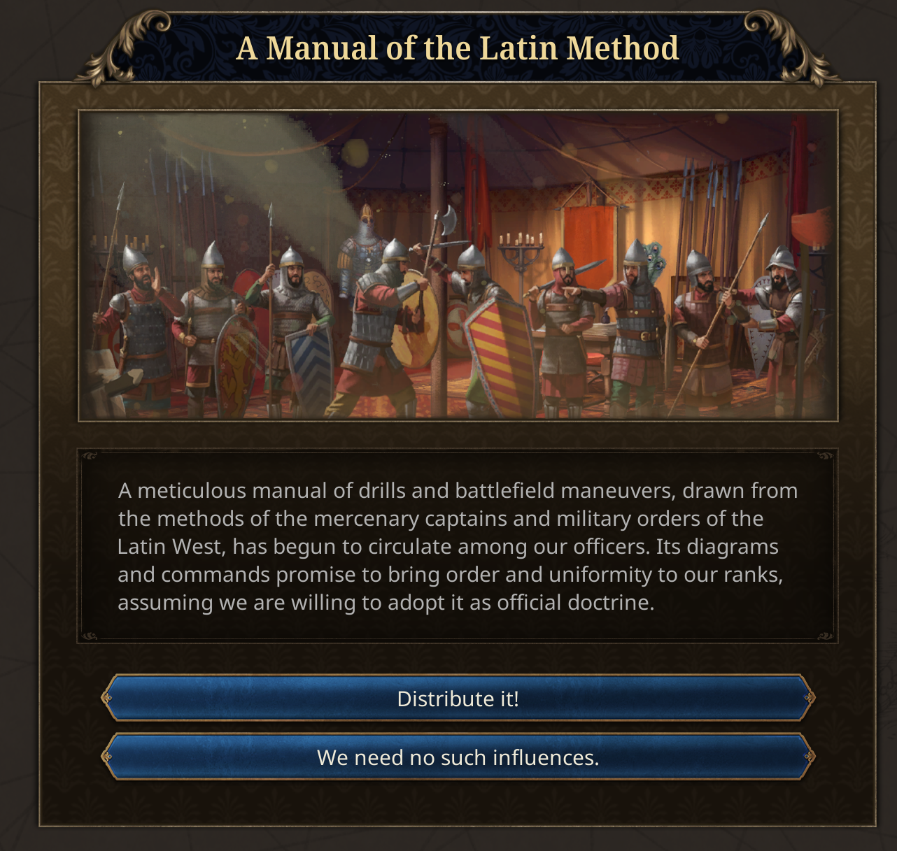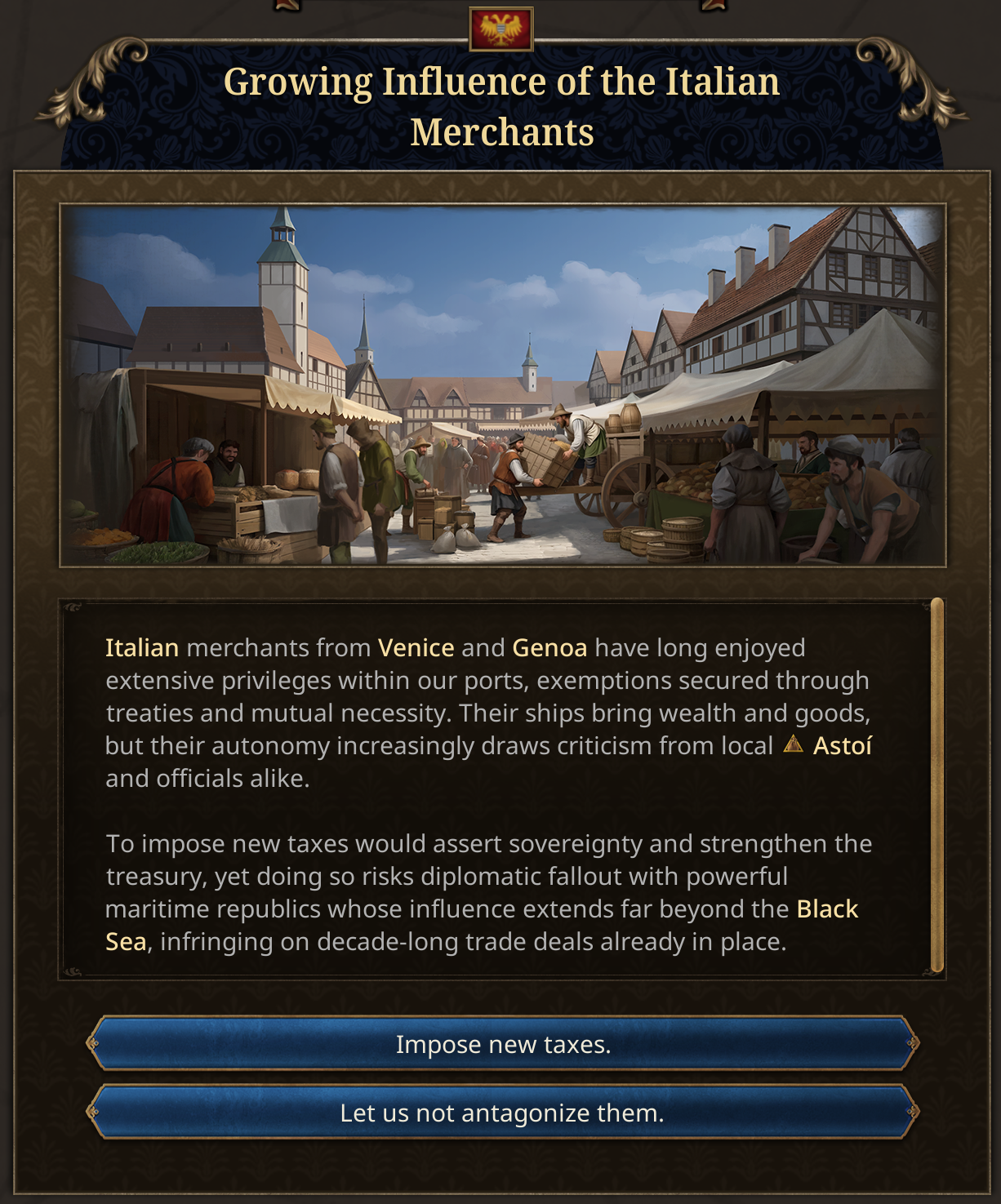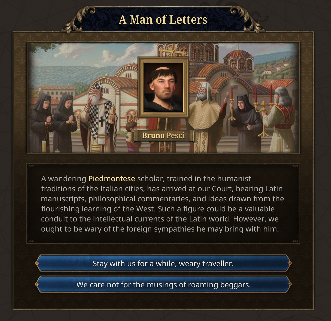 Friends, Romans, countrymen, lend me your ears. For today we will be looking into some of the miscellaneous content in the Fate of the Phoenix immersion pack.Some of the earlier events are focused around John Kantakouzenos, the nobleman who served under the incumbent Andronikos III, and eventually became emperor himself. He starts as the Head of the Cabinet, reflecting his position as Megas Domestikos. In real life, he lived to a venerable age of 91, and so his life expectancy is given a significant boost in the setup.In real life, he rejected Co-Emperorship, at least to begin with. But if you force him down that path, it opens up an event chain of courtly intrigue of Ana de Savoie.His position as Head of the Cabinet will now also put him in a prime position to take over the Regency, as he historically did upon the death of Andronikos III.We are also introducing a new Subject Type called the Prónoiai, based on the real Byzantine Prónoiai system, conditional land grants from the Emperor to military officers and officials, which evolved from temporary tax-collection appointments into hereditary holdings combining fiscal and military duties. It is more extractive than a vassal, giving gold, sailors, and manpower to the overlord, and increases the owner’s monthly legitimacy but also pushes towards decentralization.What have the Romans ever done for us? Well, some cities will start with an aqueduct system.Philipp Melanchton was a close ally of Martin Luther, and he was fascinated by the Eastern church. When the reformation happens, the country housing Philipp Melanchthon will be able to petition Byzantium for assistance. They can respond, either choosing to look upon Lutheranism favourably or aloofly ignoring them.In the past, the Byzantines deployed a napalm-like substance whose recipe was a closely guarded secret. So closely guarded in fact that by 1337 the recipe was lost to time. However the Byzantines had a cultural memory and fascination with Greek Fire, so if you have a scientist in Byzantium, you can sponsor them to rediscover Greek Fire, a costly and dangerous process that has a high chance of ending in failure.If the scientist succeeds, the secret of Greek Fire will give you access to Siphōnes fire galleys, which will aid you in defending the Bosphorus.Societal ValueBased on community feedback, we’ve been revisiting how we frame the Latinitas vs Hellenismos societal value. Our original design did not fully capture the nature of the choices facing the Byzantine Empire in the 14th and 15th centuries.Latinitas is now more clearly associated with engagement with the contemporary Latin West. It represents the political influence of the internal factions who believe that the Empire’s survival depends on closer ties with the Latins through diplomacy, religious compromise, and the selective adoption of Western currents and Renaissance thought. Shaped by contact with Frankish kingdoms and Italian republics, Latinitas looks for foreign support and renewal in a time of mounting pressure. As the Empire expands into historically Romance regions, particularly in Italy, this outlook may strengthen further, encouraging accommodation and integration with Latin elites and populations.The illustration will also change to be less Imperator’s SPQR and instead reflect Renaissance Italy’s depictions of their nostalgia for Pax Romana.Meanwhile, Hellenismos has been reworked into Romanismos. It reflects the political power of those who understand that the Empire endures through its unbroken Roman inheritance: rooted in Constantinople as the seat of empire, upheld by the Orthodox Church, and sustained by long-established imperial institutions. Romanismos does not represent a novel Greekish direction, but the continuation of what already exists: the Roman Empire as it has always been, requiring preservation rather than transformation.You will get several events as you navigate this political dichotomy that represent the real push-and-pull that was happening inside the Byzantine court.And on the topic of events, we have also been working on a much-requested quality of life tool for players to see the list of unique events that a country has access to. Players will be able to use a searchable, filterable, tooltippable database of Dynamic Historical Events, so they can plan out which path they want to go down and see why some events fire and some events don’t. Bear in mind this is very WIP.This Tinto Talks has just a hint of the kind of content you can find in Fate of the Phoenix, but there is a lot more to discover as you play.In the patch 1.2 Echinades we have also added a lot of free content to countries in the Byzantine sphere. There 5 new works of art in the Balkans, over 300 new advances spread around Greek Minors, Frankokratia, and the Balkans, more than a hundred new events, new government reforms, privileges, etc. The whole region will now be a much more exciting place to rule in.Next week we will take a look at what the c