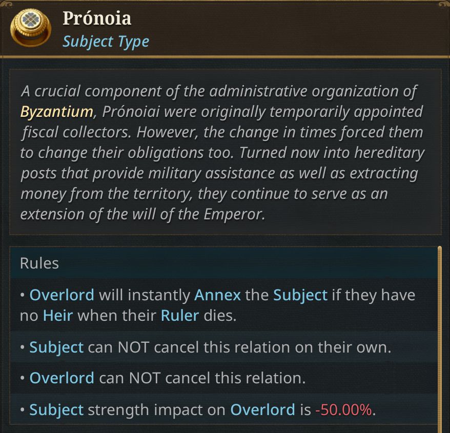 We are also introducing a new Subject Type called the Prónoiai, based on the real Byzantine Prónoiai system, conditional land grants from the Emperor to military officers and officials, which evolved from temporary tax-collection appointments into hereditary holdings combining fiscal and military duties. It is more extractive than a vassal, giving gold, sailors, and manpower to the overlord, and increases the owner’s monthly legitimacy but also pushes towards decentralization.