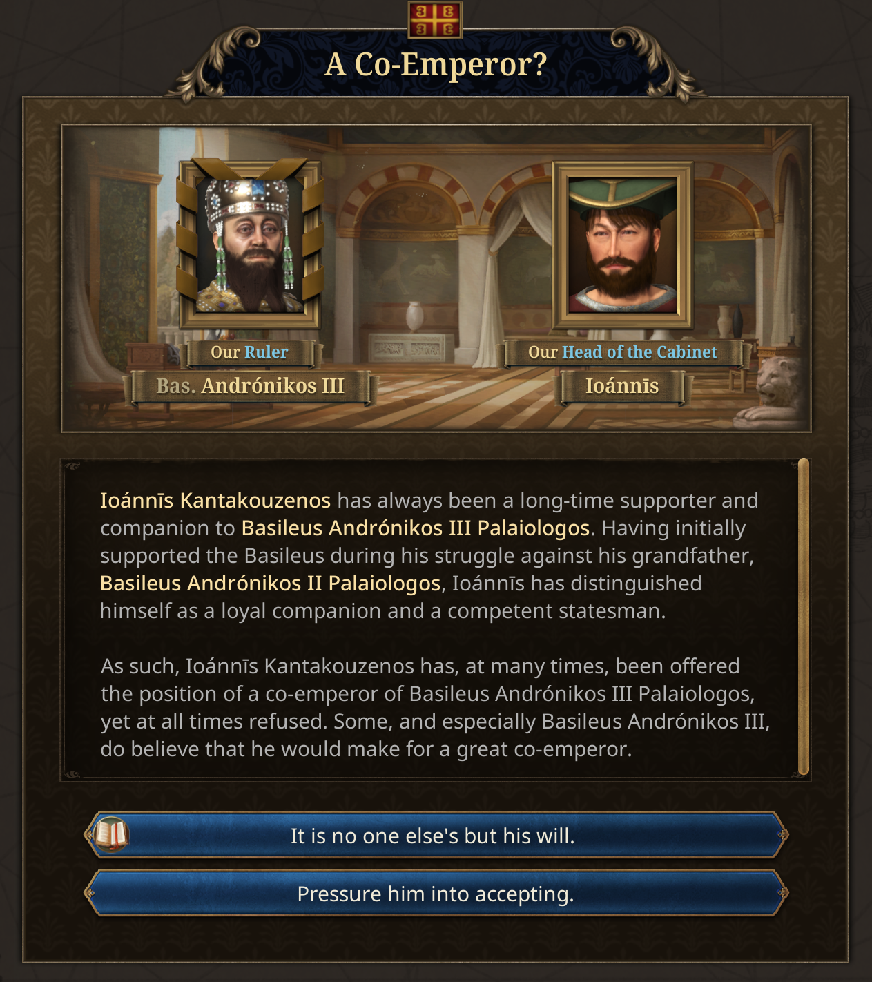 In real life, he rejected Co-Emperorship, at least to begin with. But if you force him down that path, it opens up an event chain of courtly intrigue of Ana de Savoie.