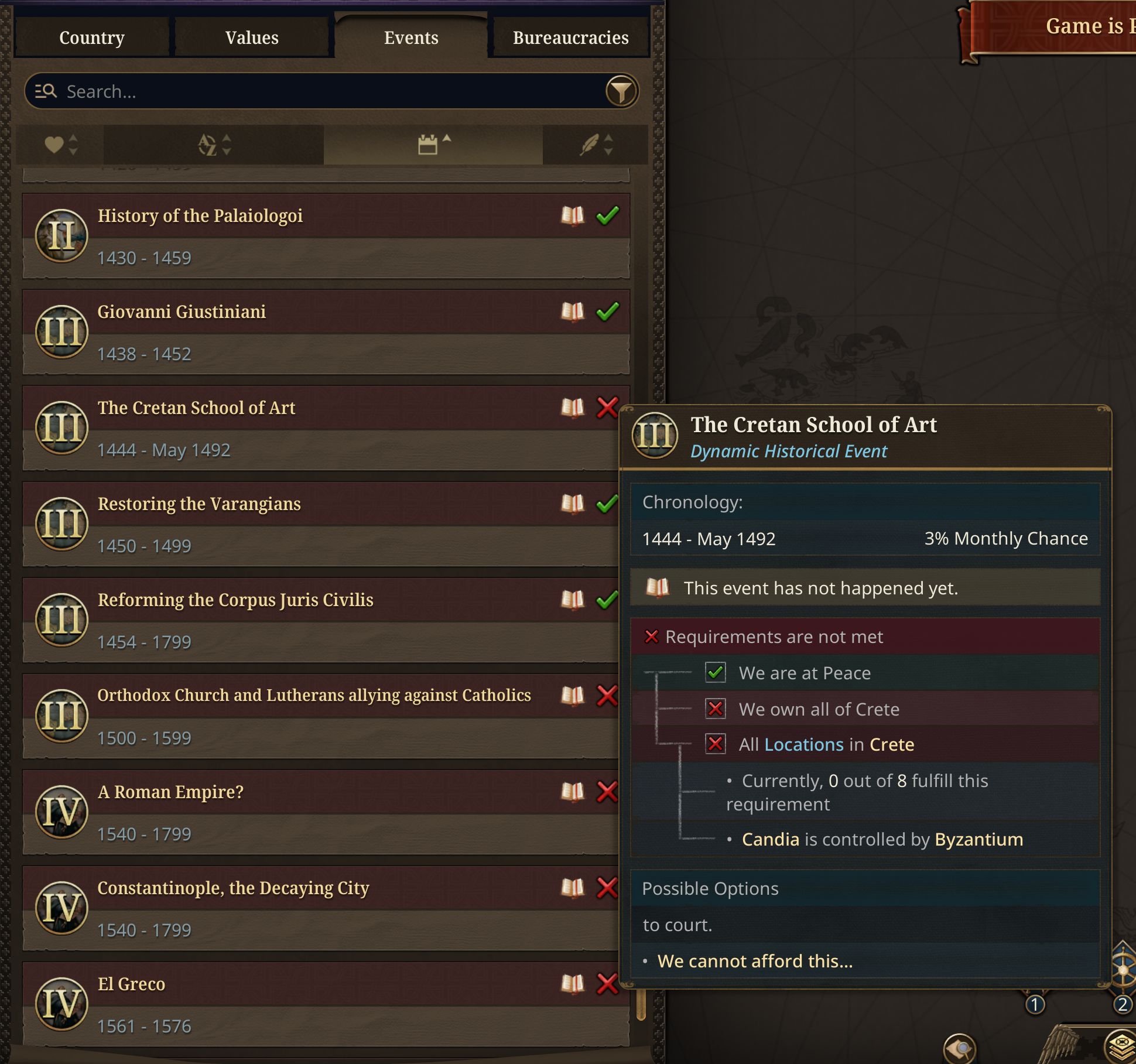 And on the topic of events, we have also been working on a much-requested quality of life tool for players to see the list of unique events that a country has access to. Players will be able to use a searchable, filterable, tooltippable database of Dynamic Historical Events, so they can plan out which path they want to go down and see why some events fire and some events don’t. Bear in mind this is very WIP.