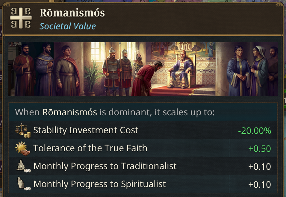 Based on community feedback, we’ve been revisiting how we frame the Latinitas vs Hellenismos societal value. Our original design did not fully capture the nature of the choices facing the Byzantine Empire in the 14th and 15th centuries.