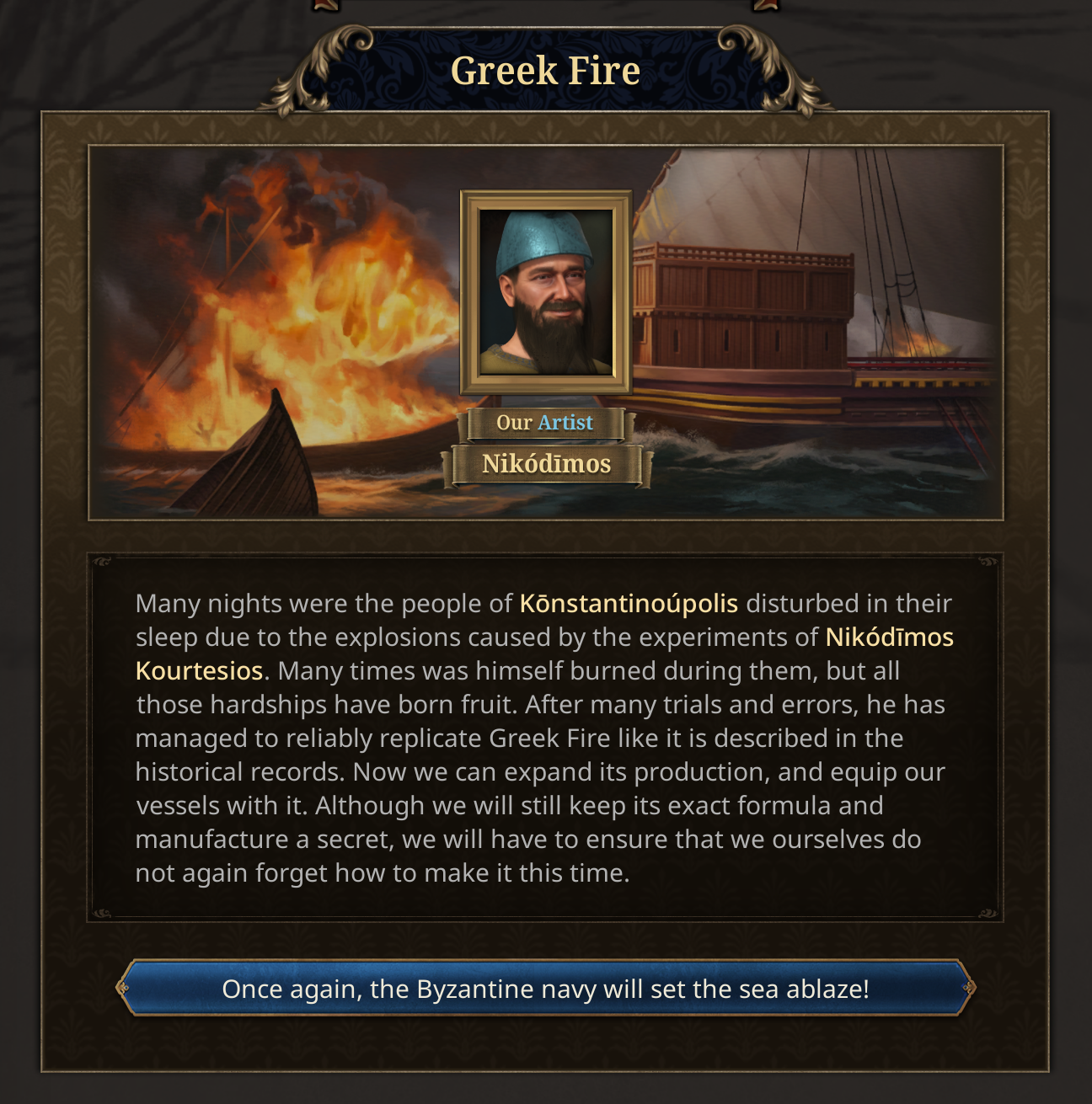 If the scientist succeeds, the secret of Greek Fire will give you access to Siphōnes fire galleys, which will aid you in defending the Bosphorus.