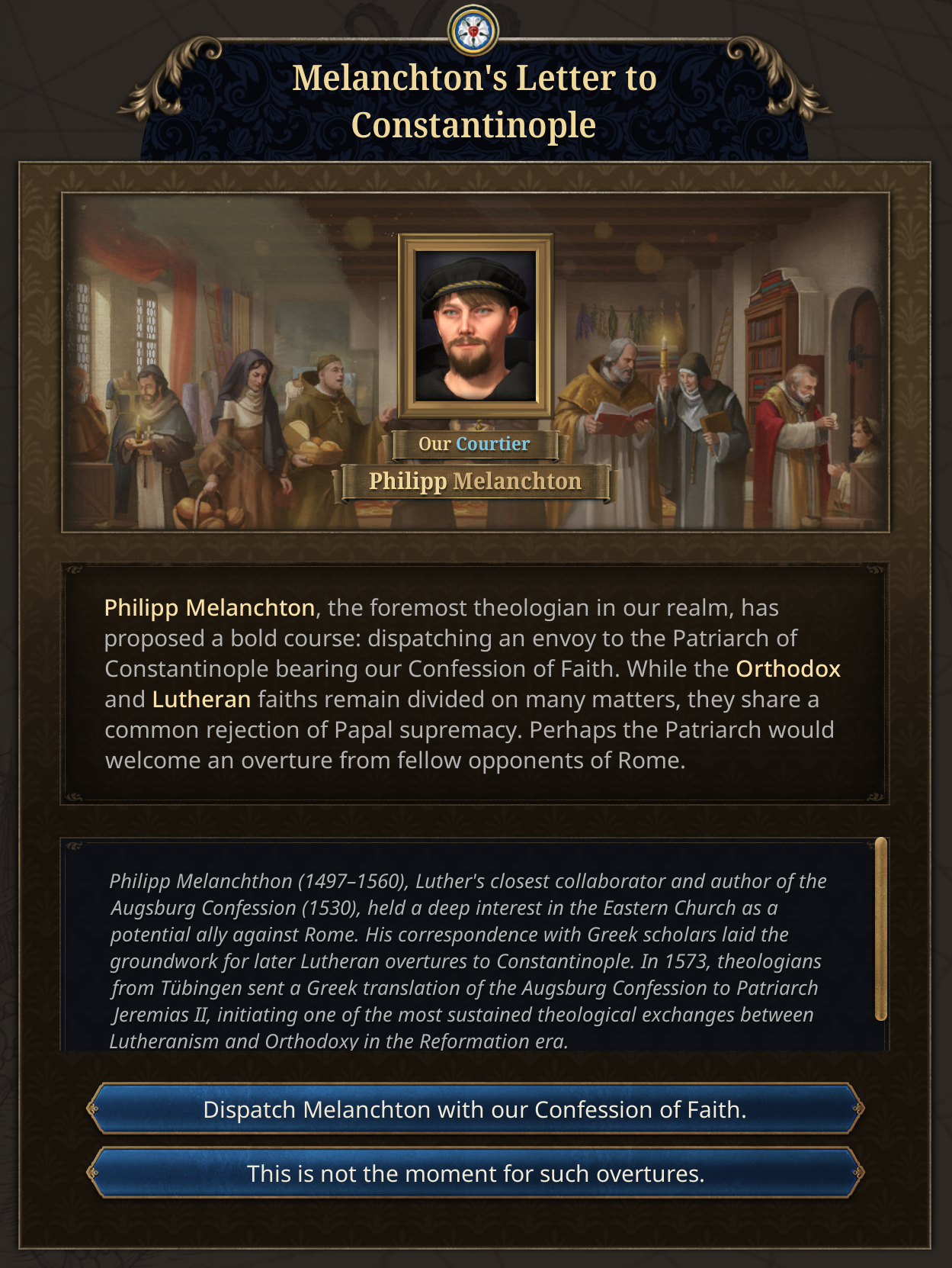 Philipp Melanchton was a close ally of Martin Luther, and he was fascinated by the Eastern church. When the reformation happens, the country housing Philipp Melanchthon will be able to petition Byzantium for assistance. They can respond, either choosing to look upon Lutheranism favourably or aloofly ignoring them.