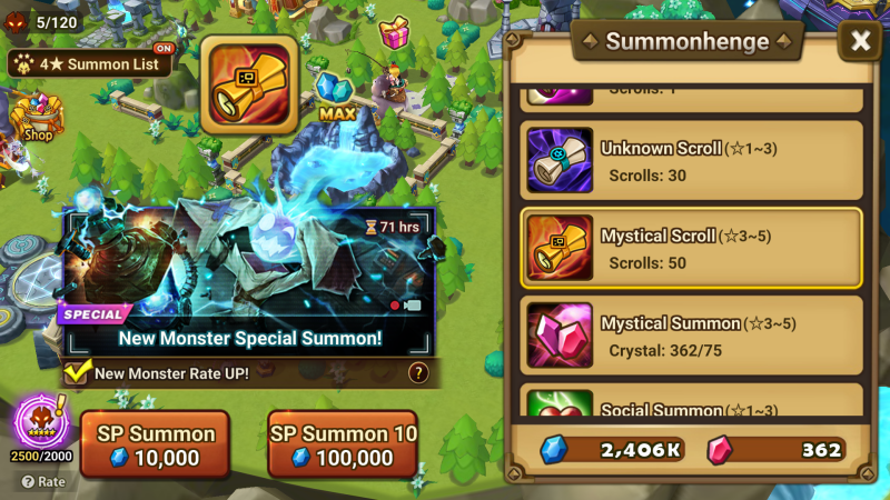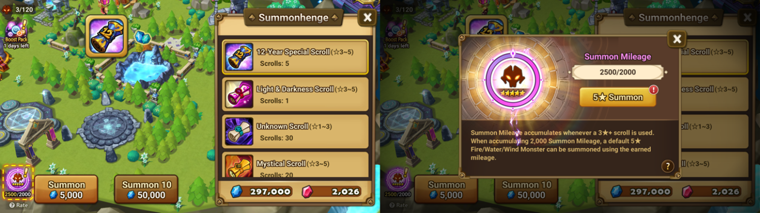 - Summon Mileage is accumulated whenever a default 3★ or higher scroll is used at the Summonhenge.