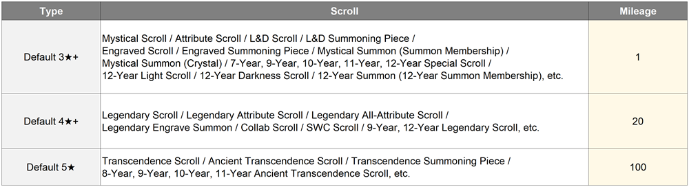: The types of scrolls eligible for Summon Mileage and the mileage earned per scroll are as follows.
