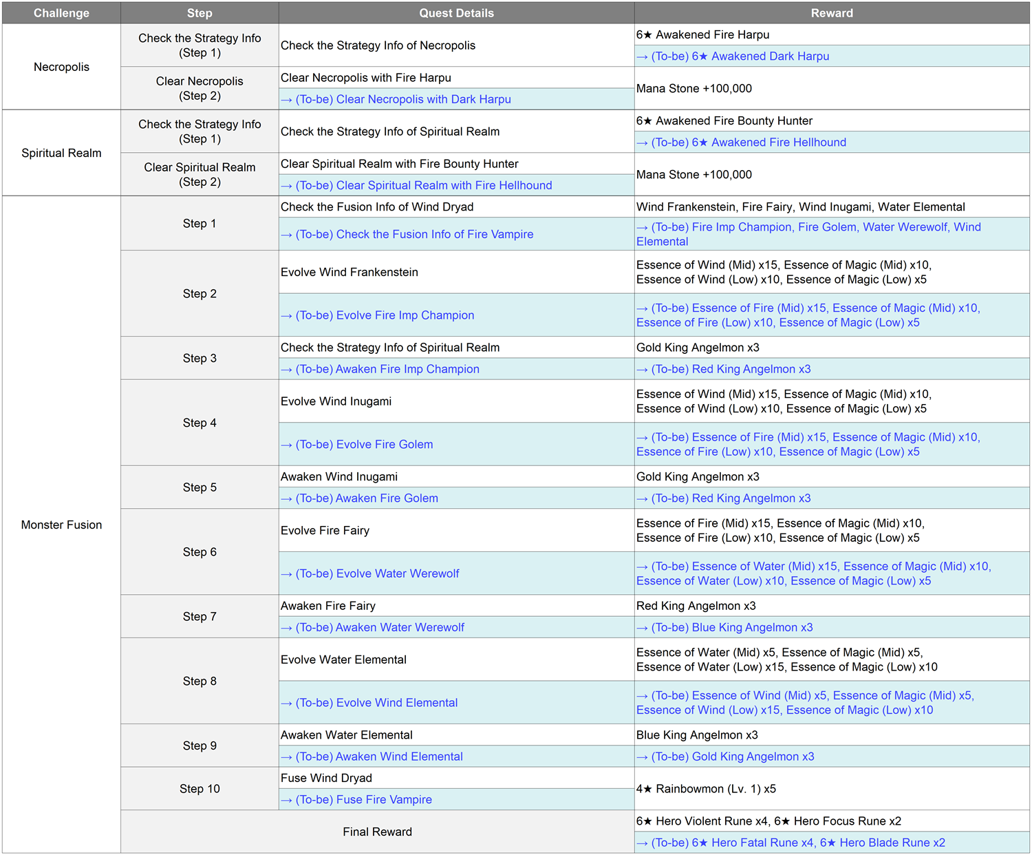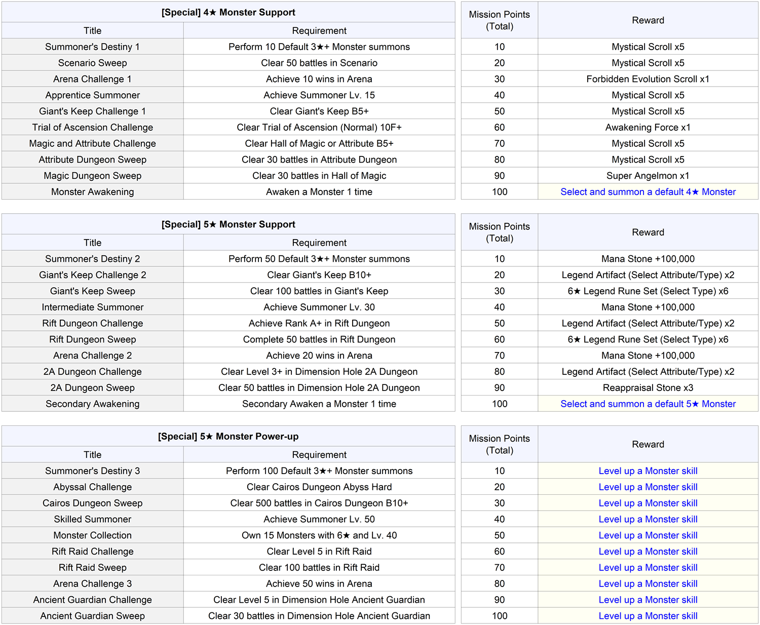 * Missions for reaching Summoner Levels, clearing the Trial of Ascension, and owning 6★ Lv. 40 Monsters will be applied retroactively. Other missions must be completed after they are unlocked.