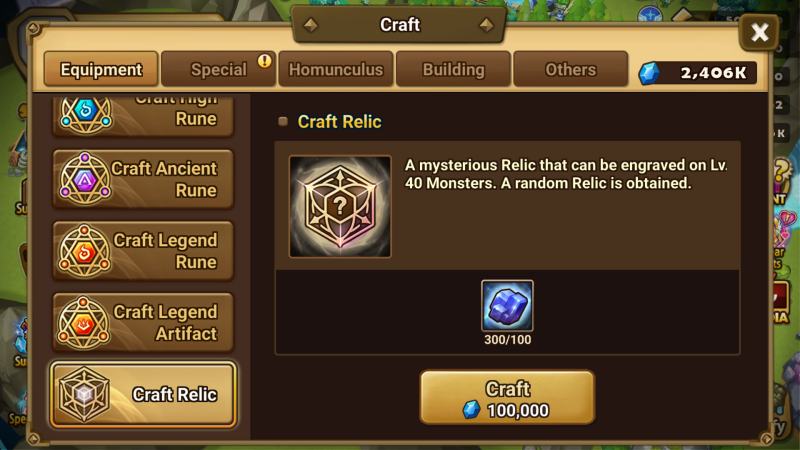 : The existing \[Runes/Artifacts] menu has been renamed to \[Equipment], and you can craft Relics under this menu. The main and unique properties of crafted Relics are assigned randomly.