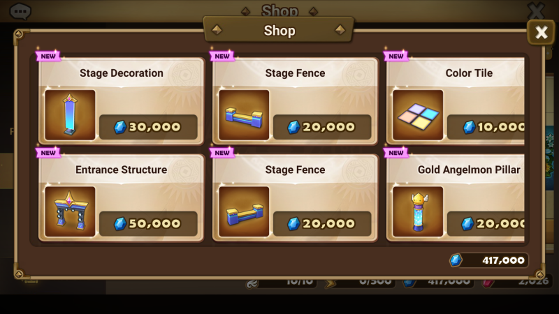 - \[Shop > Normal > Building > Decoration]: Stage Decoration / Entrance Structure / Stage Fence (2 types) / Color Tile / Gold Angelmon Pillar / Red Angelmon Pillar / DJ Booth / Stage Lighting / Big Speaker / Festival Fountain