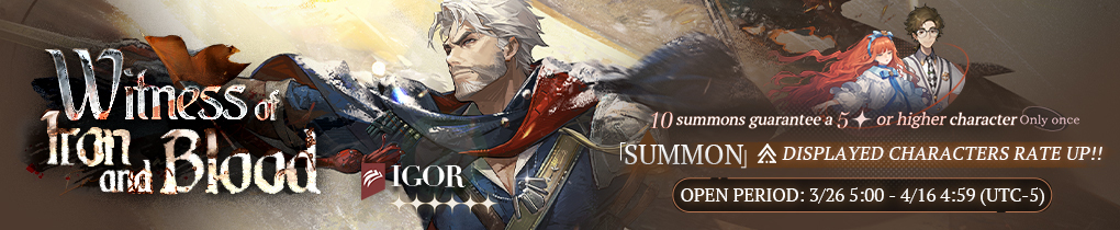 The Campaign's TaleNew Main Story ChapterChapter 12: The Campaign's TaleThe aftermath of conflict ripples across the quiet river. The scent of gunpowder hangs in the air over the golden fields of autumn. Wanderers who have been away from home for a long time set aside their past disputes and blow the horn one last time. They do this for what was lost in the past, for the stirrings of the present, and for the future yet to unfold. They do it for the spring that will surely come once the ice melts away.\[Eligibility]: Complete the main story \[A Long Long Way].Main Event\[Eligibility]: Complete the main story 1ST-16 \[Heaven Apostles].\[Duration]: After the version update on 2026-03-05 - 2026-04-13 04:59 (UTC-5)\[Event Shop]: After the version update on 2026-03-05 - 2026-04-16 04:59 (UTC-5)\[Event Intro]: The new main story \[The Campaign's Tale] and battles will be available during the event. Consume Cellular Activity in main story, Insight, and Resource stages (excluding Reflections stages) to gain \[Wartime Coin] and possibly gain \[Picrasma Gummy]. \[Wartime Coin] can be exchanged for event rewards in the event shop \[Safe House Supplies].※\[Picrasma Gummy]: Bear-shaped candies, always the first to sell out. It restores a small amount of Cellular Activity, yet its shelf life is short. Enjoy it before it expires!\[Main Rewards]: Clear Drops, \[Wartime Coin], and Picrasma Gummy From the Quiet Steppe\[Duration]: After the version update on 2026-03-05 - 2026-04-13 04:59 (UTC-5)\[Event Intro]: Complete tasks in \[From the Quiet Steppe] to obtain rewards during the event.\[Main Rewards]: \[Wartime Coin]Safe House Supplies\[Duration]: After the version update on 2026-03-05 - 2026-04-16 04:59 (UTC-5)\[Event Intro]: During the event, you can exchange for rewards in the event shop by consuming \[Wartime Coin]. \[Main Rewards]: New 6-Star Psychube - \[Singleness of Heart], Gluttony, Crystal Casket, Unilogs, Part of \[Along the Don River] Theme Islands, Vision Blocks, Delicate Insight Materials, Delicate Resonance Materials, Old Tickets, Dusts, Sharpodonties, and moreIn the Name of ChivalryMarsha's Character Story\[Eligibility]: Complete the main story 1ST-16 \[Heaven Apostles].\[Duration]: After the version update on 2026-03-05 - 2026-03-26 04:59 (UTC-5)\[Event Intro]: Old bandages, the scent of blood, a gloom that never fades. Ancient oaths converge with future duty. Bringing light where one can, offering comfort where one may.Control the core's absorption of emotion fragments, keeping negative emotions below the stress threshold.\[Main Rewards]: Clear Drops, Growth Materials Into the MaelstromIgor's Character Story\[Eligibility]: Complete the main story 1ST-16 \[Heaven Apostles].\[Duration]: 2026-03-26 05:00 - 2026-04-16 04:59 (UTC-5)\[Event Intro]: "Soldiers, soldiers," the commander orders, "Face the golden steppe. Don't look back at the hydrangeas."Spend resources to deploy different units against the enemy and destroy the enemy's command center.\[Main Rewards]: Clear Drops, Growth Materials\[The Campaign's Tale I] Sign-in Event\[Eligibility]: Complete the main story 1ST-01 \[Wretched Brats].\[Duration]:After the version update on 2026-03-05 - 2026-03-26 04:59 (UTC-5)\[Event Intro]:During the event, sign in for 7 days in total to get Unilog x7.\[The Campaign's Tale II] Sign-in Event\[Eligibility]: Complete the main story 1ST-01 \[Wretched Brats].\[Duration]:2026-03-26 05:00 - 2026-04-16 04:59 (UTC-5)\[Event Intro]:During the event, sign in for 7 days in total to get Unilog x7.War RoomReward Update\[Eligibility]: Complete the main story 1ST-16 \[Heaven Apostles].\[Event Time]: After the version update on 2026-03-05 (UTC-5)\[Update Details]: Added a \[Relation Network] feature. Here, you can view the relationships between characters in all main stories of the 3.0 series.\[Reward Update]: Key of Thought, Exquisite Insight Package※More reward content will be added in the future.\[Reveries in the Rain]New Challenge Gameplay - Tides of Thought\[Eligibility]: Complete the main story 5TH-20 \[The Truth Seeker].\[Duration]: After the version update on 2026-03-05 (UTC-5)\[Time-Limited Task Time]: After the version update on 2026-03-05 - 2026-04-16 04:59 (UTC-5)\[Event Intro]: \[Tides of Thought] are consciousness disasters occurring in a localized area of the \[Depths of Myth]. Following its detection, further phenomena may be studied through observation.�?Once \[Tides of Thought] is open, you can enter via the \[Depths of Myth] home page.�?When challenging regular stages with characters in the Suitcase and tryout Euphoria characters, you will collect \[Boss Parts], \[Modifiers], and \[Environment]. In the subsequent boss challenge, you can implant these components into the boss. This alters the boss's appearance and abilities, and increases the \[Projection] earned upon victory. Your choice of implanted components affects the \[Projection].�?Your challenge team can include one additional support character from the Suitc