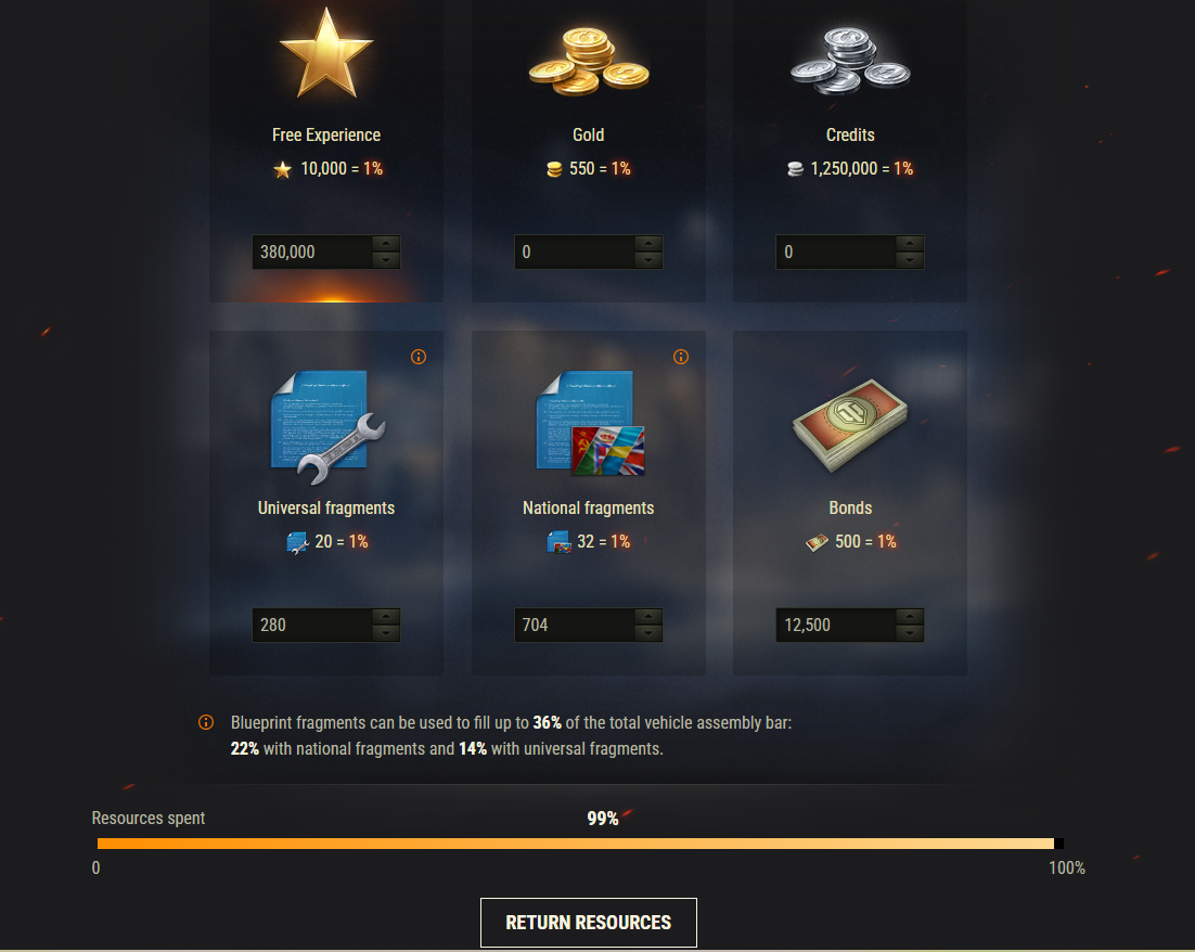 Invest Resources: Use in-game resources, including blueprint fragments, Free XP, credits, gold, and bonds, to construct the Vickers MBT Mk. 3 and/or the DBV-152.