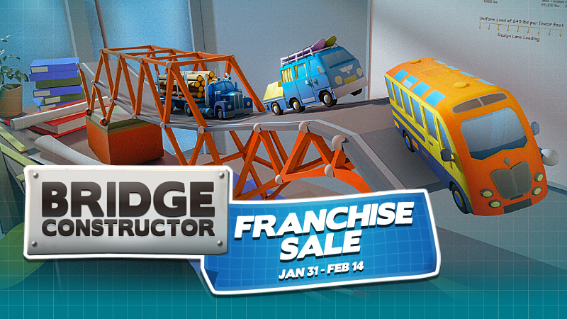 Dear constructors and engineers,It’s time for the 2026 edition of the Bridge Constructor Franchise Sale!2025 has been a busy year for our – not only have we launched our quintessential Bridge Constructor experience Bridge Constructor Studio on PC, but also across consoles and even VR headsets!Bridge Constructor Studio is the ultimate experience for builders and a must-have for fans of engineering puzzles and creative sandbox games.To celebrate the last year and to start off 2026 with a proper “Thank you” for your continued support, we’re happy to offer you the following discounts across the whole franchise. Whether you’re looking to complete your collection or jump into a Bridge Constructor game for the very first time – now is the perfect chance!From now until February 14 ALL Bridge Constructor games including Bridge Constructor Portal and the latest installment Bridge Constructor Studio are up to 92% off:Bridge Constructor - 92% offBridge Constructor Trains - Expansion Pack - 77% offBridge Constructor Studio - 50% offBridge Constructor Medieval - 92% offBridge Constructor Playground - 92% offBridge Constructor Portal - 92% offBridge Constructor Portal - Portal Proficiency - 83% offBridge Constructor Stunts - 92% offBridge Constructor: The Walking Dead - 92% offAll the best and happy bridge building!ClockStone & Headup