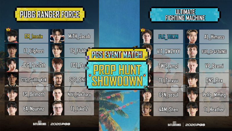 You've seen them lift the PUBG Global Series trophy. You've seen incredible clutches, outplays, last-minute turnarounds. But nothing has prepared our PUBG Esports pro players for the ultimate gauntlet: the Prop Hunt Showdown.Two teams, captained by TGLTN and Inonix will face off to become the Prop Hunt Showdown World Champions - and the stakes have never been greater. Ever. (unless we do this again).The action is about to kick off (at 12:00 CEST) on YouTube, Twitch & Kick!