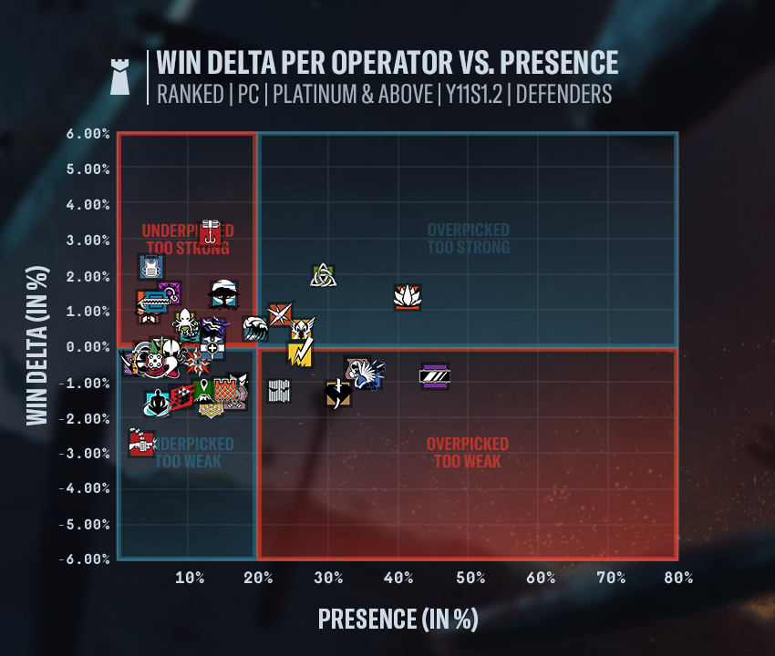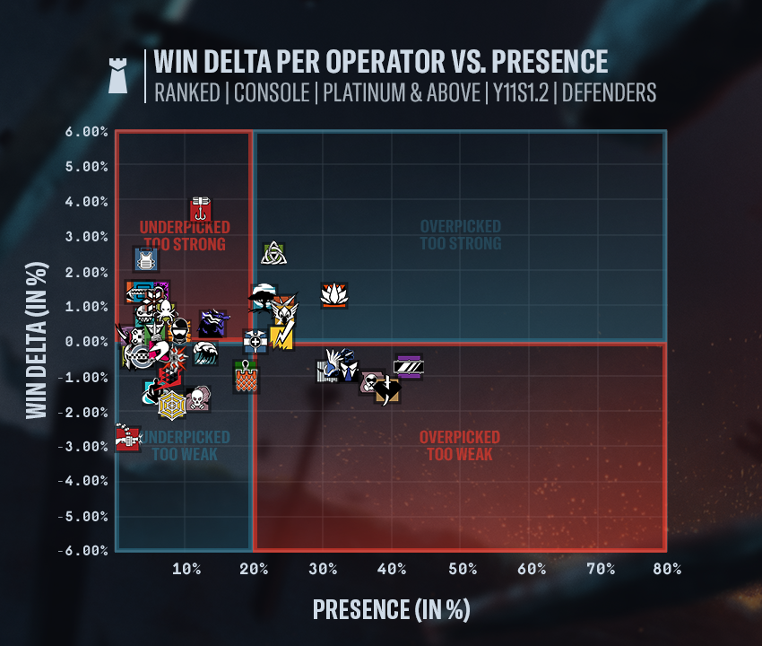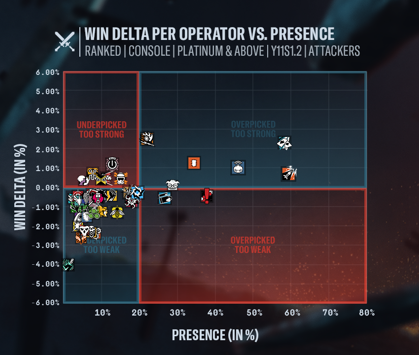In the Y11S1.2 Designer’s Notes, we take a deeper look at the upcoming balancing update, with insights into each major change.WIN DELTA VS. PRESENCE AND TOP OPERATOR BANS\[PC] WIN DELTA VS. PRESENCE\[CONSOLE] WIN DELTA VS. PRESENCE\[PC] TOP OPERATOR BANS\[CONSOLE] TOP OPERATOR BANSOPERATOR BALANCINGRAUORAWe’re updating Rauora’s launcher to strengthen her presence as a zone control. Increasing the launcher’s range and providing all charges at the start of the round give Rauora more flexibility, letting her establish fortified zones without relying on cooldowns. These adjustments support more deliberate planning, especially on larger or more open sites where her previous limitations reduced her influence.On the panel side, we’ve focused on sharpening the contrast between ally and enemy interactions. Panels now open and close more quickly for attackers, improving flow and responsiveness during rotations. At the same time, defenders face significantly longer interaction times, reinforcing Rauora’s delaying power and raising the risk of pushing through her utility.D.O.M. PANEL LAUNCHERRange increased to 25 meters (from 15).Resource management changed to fixed amount.All 4 charges are available at the beginning of the round.D.O.M. PANELTrigger opening time reduced to 0.5 seconds (from 1).Panel closing time for allies reduced to 1 second (from 3).Panel opening time for enemies increased to 6 seconds (from 3).Panel closing for enemies increased to 6 seconds (from 3).Panel opening distance for Drones reduced to 1 meter (from 2).JACKALJackal gains improved vertical tracking potential. By allowing footprints to be detected from lower floors when the ceiling is opened, he becomes more consistent in multi-level engagements and gains new ways to pressure roamers.EYENOX MODEL IIIEnemies' footprints are also visible and scannable from below when destroying the ceiling.LOADOUTGadgets: Added Frag Grenades.SMOKEWe’re giving Smoke a Deployable Shield to offer more flexibility in his site setups and provide additional defensive utility. This should enhance his ability to delay pushes and create stronger hold positions.LOADOUTGadgets: Added Deployable Shield.REFINEMENT CHANGESThese are small adjustments that don’t aim to alter an operator’s overall power level or flexibility. Instead, they focus on polishing gameplay details, improving consistency, and enhancing quality-of-life without shifting the meta. Our goal is to maintain a steady stream of these refinements alongside major updates, helping the game evolve and improve at a constant pace.CLASHClash receives a significant boost to her crowd control uptime to compensate for the mobility lost at the start of the season. This lets her maintain pressure for longer and better support her team when stalling enemy advances.CCE SHIELD MK2Taser battery increased to 15 seconds (from 10).FROSTFrost’s traps become more punishing, giving defenders a slightly longer window to capitalize on a caught attacker. This also increases the tension for trapped players attempting to reposition or get revived.WELCOME MATLimping time increased to 70 seconds (from 60).GLAZThis adjustment enhances Glaz’s ability to move while keeping his sight equipped.FLIP SIGHTMovement time to reach maximum distortion increased to 15 seconds (from 12).GRIMThe deployment delay adjustment encourages more deliberate usage of Grim’s gadget and slightly reduces the effectiveness, as it will be easier to destroy by shooting at it before the swarm of bots is created.KAWAN HIVEDelay to drop the swarm canister increased to 0.6 seconds (from 0.4).THUNDERBIRDThunderbird’s healing output is being strengthened to increase her impact in sustained defensive holds.KÓNA STATIONHealth regeneration increased to 3 hp per second (from 2).Join the discussion on X, Instagram, Reddit, Discord, Facebook, WhatsApp and TikTok.Encountering a bug? Report your experience at R6Fix.