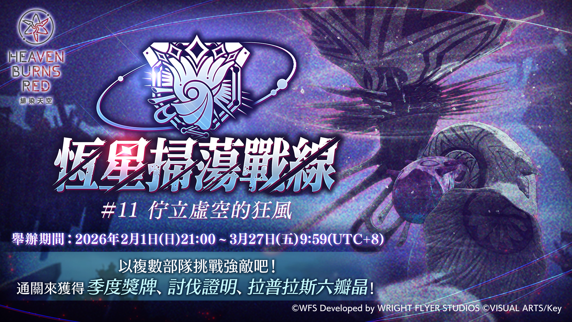 緋染天空4th Anniversary開幕!為慶祝4週年,4th Anniversary 特別活動將於2月1日起開幕!我們將實施最多200連免費的每天免費10連戰型探索和可獲得豪華報酬的賓果任務等特別活動。故事活動「主線故事過去篇 Communication Breakdown」!笨拙的靈魂殘響。苦於和軍官之間溝通不良的手塚接受了白河的建議,決定先從和七瀨的對話開始改善。另一方面,30G和30A正在調查人們從圓頂避難所消失的事件……▼宣傳影片舉辦期間2026/2/1(日)21:00 ~ 2026/2/27(五)9:59(UTC+8)為止收集可在活動中獲得的「交換所獎牌」,即可交換戰術型態「S[愛心飯糰]藏里見」,並能突破至最大極限!SS七瀨七海登場!舉辦「期間限定 4th Anniversary戰型探索」!「期間限定 4th Anniversary戰型探索」中,期間限定SS「[約定在晨曦的彼端]七瀨七海」經精選出現機率上升!第10次必出S以上戰術型態!此外,在本戰型探索中,新精選戰術型態在首次獲得時,為突破極限Lv.1的狀態。舉辦期間2026/2/1(日)21:00 ~ 2026/2/27(五)9:59(UTC+8)為止【戰術型態介紹】介紹SS[約定在晨曦的彼端]七瀨七海(CV 內田秀)!屬性:雷、突儲存超越量表,給予雷屬性戰術型態強力支援的ADMIRAL透過能強化攻擊力、給予SP的EX技能來鼓舞我方,使萬雷轟鳴※部隊僅能編組1名ADMIRAL戰術型態。緋染天空 4th Anniversary 特別賓果任務為了慶祝緋染天空 Heaven Burns Red 4th Anniversary,將實施「緋染天空 4th Anniversary 特別賓果任務」!達成所有任務即可獲得慶祝4週年 必出SS自選戰型探索券和合計1000個石英等豪華道具!舉辦期間2026/2/1(日)21:00 ~ 2026/3/27(五)9:59(UTC+8)為止新高難度戰鬥「異時層EX」!通關就能進行靈魂共振變換!主打緋染天空最高難度的新戰鬥遊戲內容異時層EX登場!本次登場的「異時層EX 第一章」中,可以編組2支部隊,挑戰變得更加強大的主線故事第一章敵人「DeathSlug」。報酬可獲得新道具「靈魂共振核心」!※通關主線故事第三章Day21並達成以下任意1項條件就能挑戰異時層EX。・在積分挑戰獲得最高積分3,000,000分以上・在熾天使遭遇戰演習獲得最高積分150,000分以上・在恆星掃蕩戰線通關EX+10以上使用報酬的「靈魂共振核心」,就能將SS戰術型態靈魂共振變換為SS戰術型態!本次登場的3種SS戰術型態可以靈魂共振變換為SS!・SS[歡欣雀躍Fuel]逢川惠・SS[豐樂之神秘]桐生美也・SS[響亮戰嗥]蒼井繪梨花舉辦期間2026/2/1(日)21:00 ~ (UTC+8)※首次舉辦期間:2026/2/1(日)21:00 ~ 2026/2/9(一)9:59(UTC+8)為止。※今後也會定期舉辦。【記憶庭園】追加寶玉頭目Ⅳ!記憶庭園於2/1(日)21:00(UTC+8)起追加了新的寶玉頭目「ExoWatcherΩ」、「Sinister&RectusNilΩ」、「AmonΩ」!本次會有新的3種寶玉登場!以獲得強力的飾品為目標吧!※通關主線故事第五章中篇就能挑戰寶玉頭目Ⅳ。舉辦期間2026/2/1(日)21:00 ~ (UTC+8)舉辦「恆星掃蕩戰線#11 佇立虛空的狂風」!2/1(日)21:00(UTC+8)起舉辦「恆星掃蕩戰線」!從本次起,「恆星戰」包含「EX MODE」在內的所有難度,可以從過去恆星戰通關過的最高難度開始遊玩。此外,已調整恆星戰報酬的部分內容。・EX Level4~10的報酬追加季度獎牌・調整其他難度的季度獎牌獲得數量舉辦期間2026/2/1(日)21:00 ~ 2026/3/27(五)9:59(UTC+8)為止戰鬥季度 2026.2-3 開幕!在戰鬥季度 2026.2-3中,可以交換以下5名角色的遺能寶玉。・樋口聖華・白河結奈・伊達朱里・大島二以奈・七瀨七海(※特別推出)此外,本季度起,季度獎牌交換所內追加新道具「追憶鑰匙」!並配合上述追加調整季度獎牌交換所的部分內容。從一次季度的交換所最多能獲得3個新道具「追憶鑰匙」。在「主畫面設定」使用,就能解鎖畫廊中主線故事或活動故事的部分插畫,將其設定於主畫面!舉辦期間2026/2/1(日)21:00 ~ 2026/3/27(五)9:59(UTC+8)為止實施部分戰術型態的平衡調整!在2月1日的資料更新中,將實施部分已登場戰術型態的平衡調整。・SS[將之善和]白虎・SS[撥雲見日]山脇‧波昂‧伊瓦爾・SS[再耀的CANTABILE]華村詩紀・SS[夜間巡航服務員]和泉由希・SS[希求與渴仰]小笠原緋雨舉辦期間2026/2/1(日)資料更新後 ~舉辦「慶祝4th Anniversary復刻 期間限定齊奏戰型探索」!為慶祝「4th Anniversary」,連續復刻齊奏戰術型態!期間限定戰術型態「[The Feel of the Throne]茅森月歌」、「[隨侍公主]和泉由希」、「[美麗月色]白河結奈」將依序舉辦精選戰型探索。舉辦期間①2026/2/6(五)10:00 ~ 2026/2/10(二)9:59(UTC+8)為止「慶祝4th Anniversary復刻 期間限定齊奏戰型探索 -茅森月歌-」②2026/2/10(二)10:00 ~ 2026/2/15(日)9:59(UTC+8)為止「慶祝4th Anniversary復刻 期間限定齊奏戰型探索 -和泉由希-」③2026/2/15(日)10:00 ~ 2026/2/20(五)9:59(UTC+8)為止「慶祝4th Anniversary復刻 期間限定齊奏戰型探索 -白河結奈-」