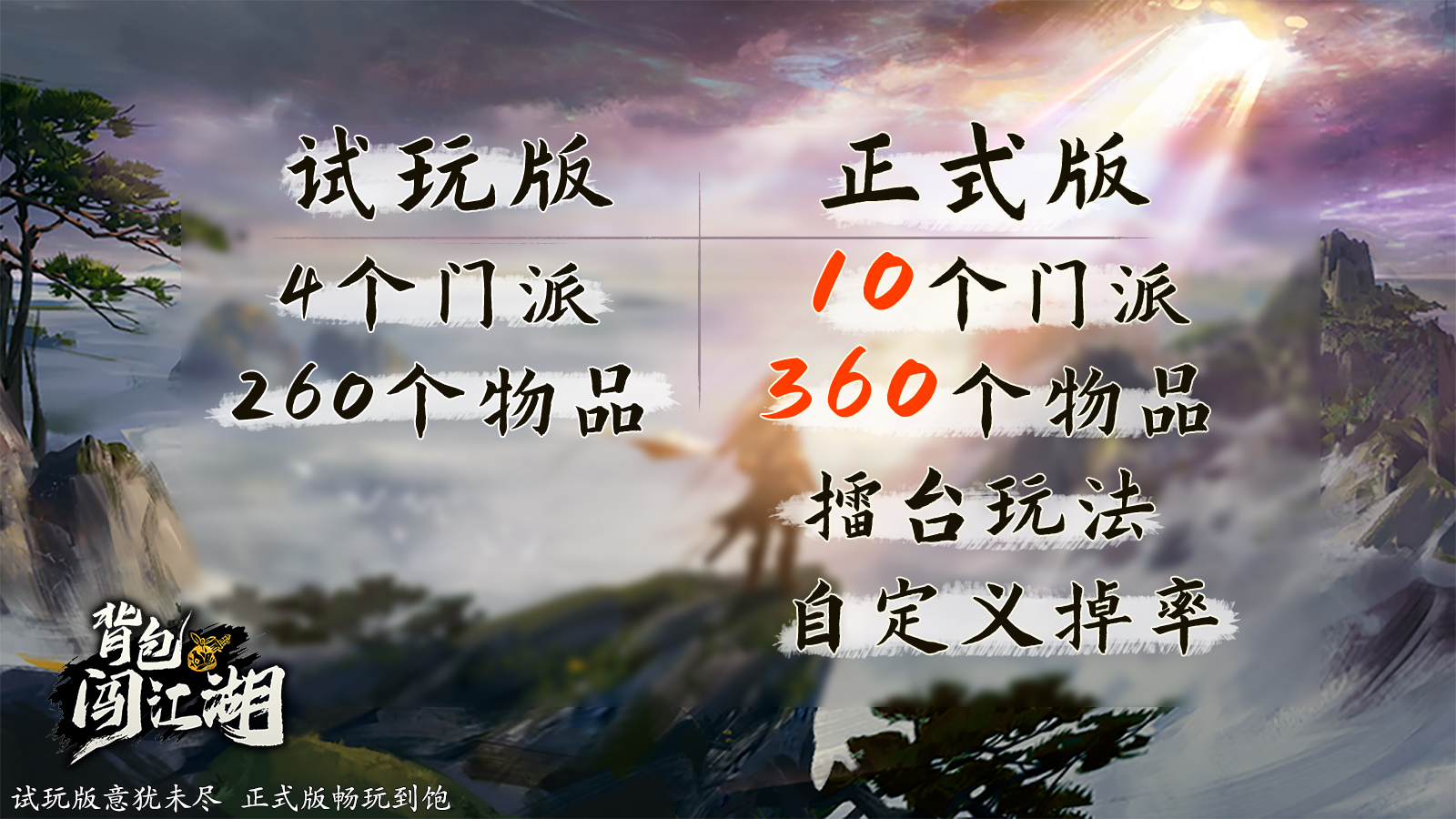 《背包闖江湖》正式版已發售。原價 46 元RMB,首發折後價 39.1 元RMB,折扣持續 14 天。同時會有幾個友好遊戲的捆綁包,折扣 10%,疊加獲得折上折。在經過數月更新打磨,我們終於完成了遊戲的正式發售內容。除了華山、武當、少林、五毒這四個門派之外,追加開發了血刀、丐幫、逍遙、唐門、六扇門、峨眉這六個新門派,總共包含 10 個門派。在代碼對戰之外,新增了擂台玩法。每週一期擂主,挑戰獲勝後獲得獎杯。聽取玩家的建議,給段位、獎杯賦予實際作用,它們可以轉化為「金幣」。在圖鑑系統中,金幣用於調控物品的出現機率提升、降低。隨著遊戲深入,解鎖越來越大的物品池,想要的物品總也撈不到,那麼這項功能正是應對這個問題。可以看下圖,了解試玩版和正式版的內容區別:我當然知道,粗糙的遊戲美術,借鑑的核心玩法,是遊戲避不開的短板。但在這之外,我們在地圖玩法上積極融合創新、保持較高的更新頻率和品質、聽取玩家意見並認真測試,這些是我們的長板。以勤奮彌補創意。在正式發售後,我們會積極聽取玩家的改進意見,大家可以通過加 Q 群和Discord反饋。如果我做得不好,也歡迎通過 Steam 評價「激烈」地反饋,我是高速上網之人,哪裡的評價建議都會看。在資金健康的情況下,會持續更新地圖模式、門派等,但這暫不能作為承諾,請潛在玩家僅根據正式版內容和當時價格來評估是否值得購買,不要購買未來預期。無論更新量多還是少,本遊戲的定位是肉鴿爽遊,以自由構築、爽快數值為核心體驗,必不會做無腦削弱強勢卡牌、加強敵人的逆天之事。請放心入坑。